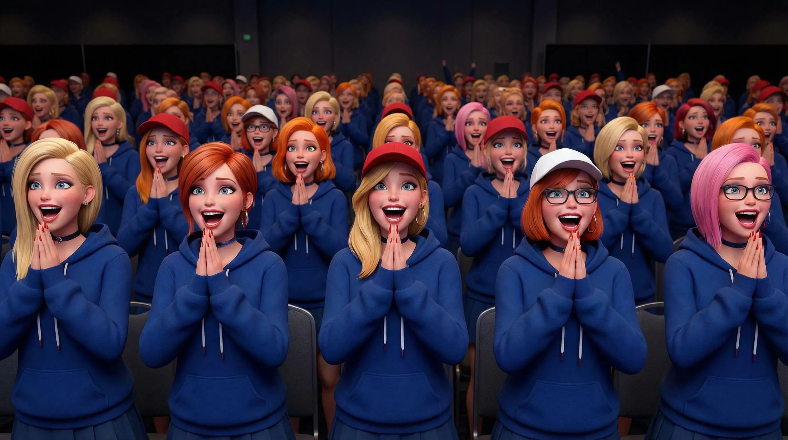 Create anime-inspired CGI crowds with Final Fantasy hairstyles in deep blue hoodies featuring moe sleeves hiding praying hands. Vibrant accessories like baseball hats, chokers, and colored nails. Generate diverse characters with elated expressions, side-swept hair, and unique sleeve styles using this AI image generator for vivid fan art scenes.