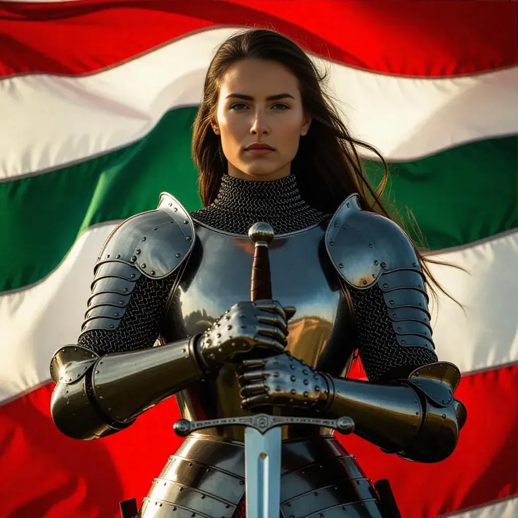 A valiant female knight, clad in intricate medieval armor, stands proudly beneath the vibrant Hungarian flag. The flag waves majestically in the wind, its tricolor stripes of red, white, and green contrasting against a dramatic sky. The knight holds a gleaming sword, her determined gaze reflecting courage and honor.