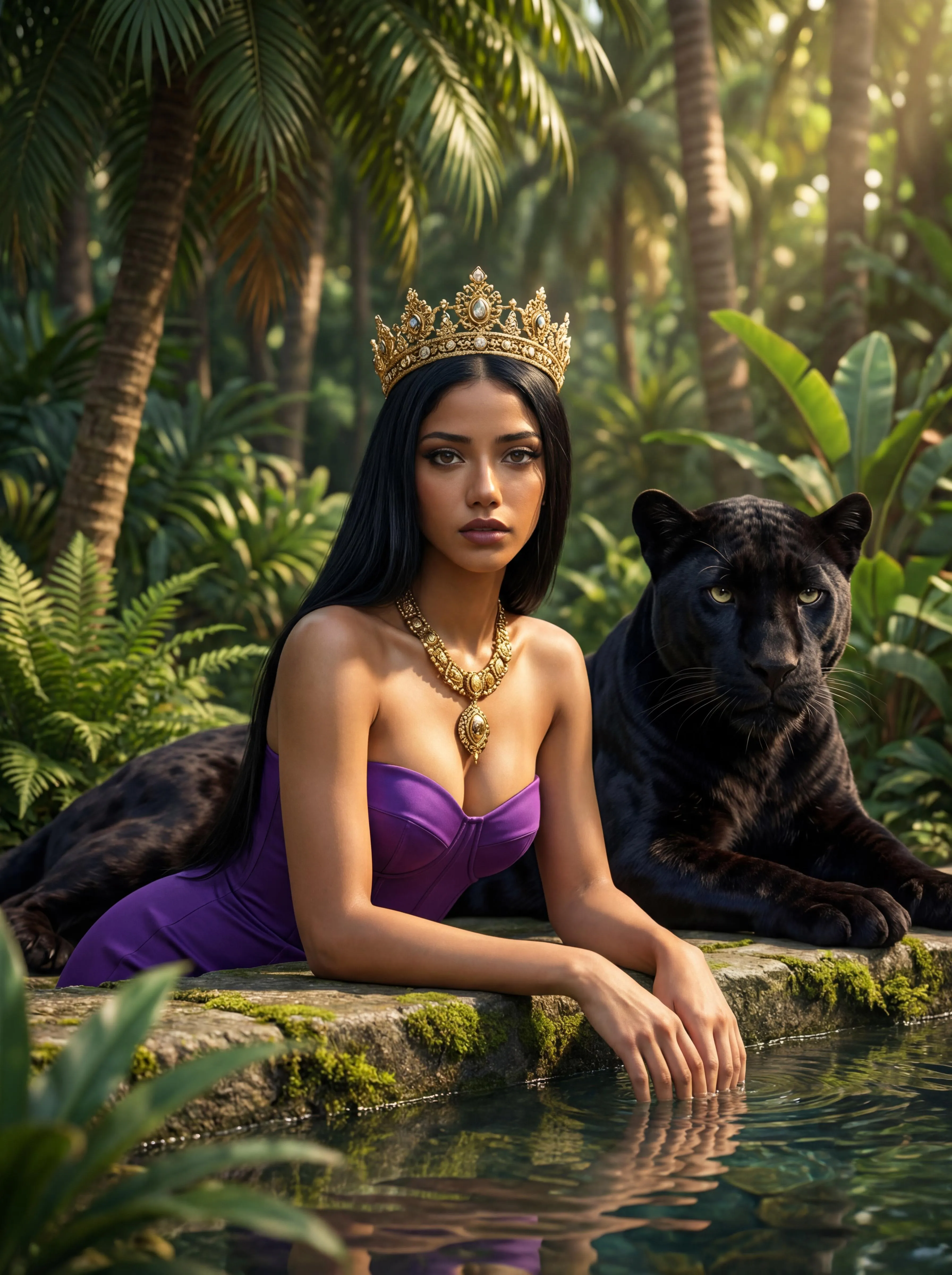 Create hyper-realistic jungle queen AI portraits with vivago.ai. Generate a powerful, regal woman with sleek black hair in a striking purple dress, adorned with gold crown & necklace, alongside a majestic black panther. Lush tropical jungle setting with cinematic lighting & vibrant colors. Transform your vision into professional fantasy art.