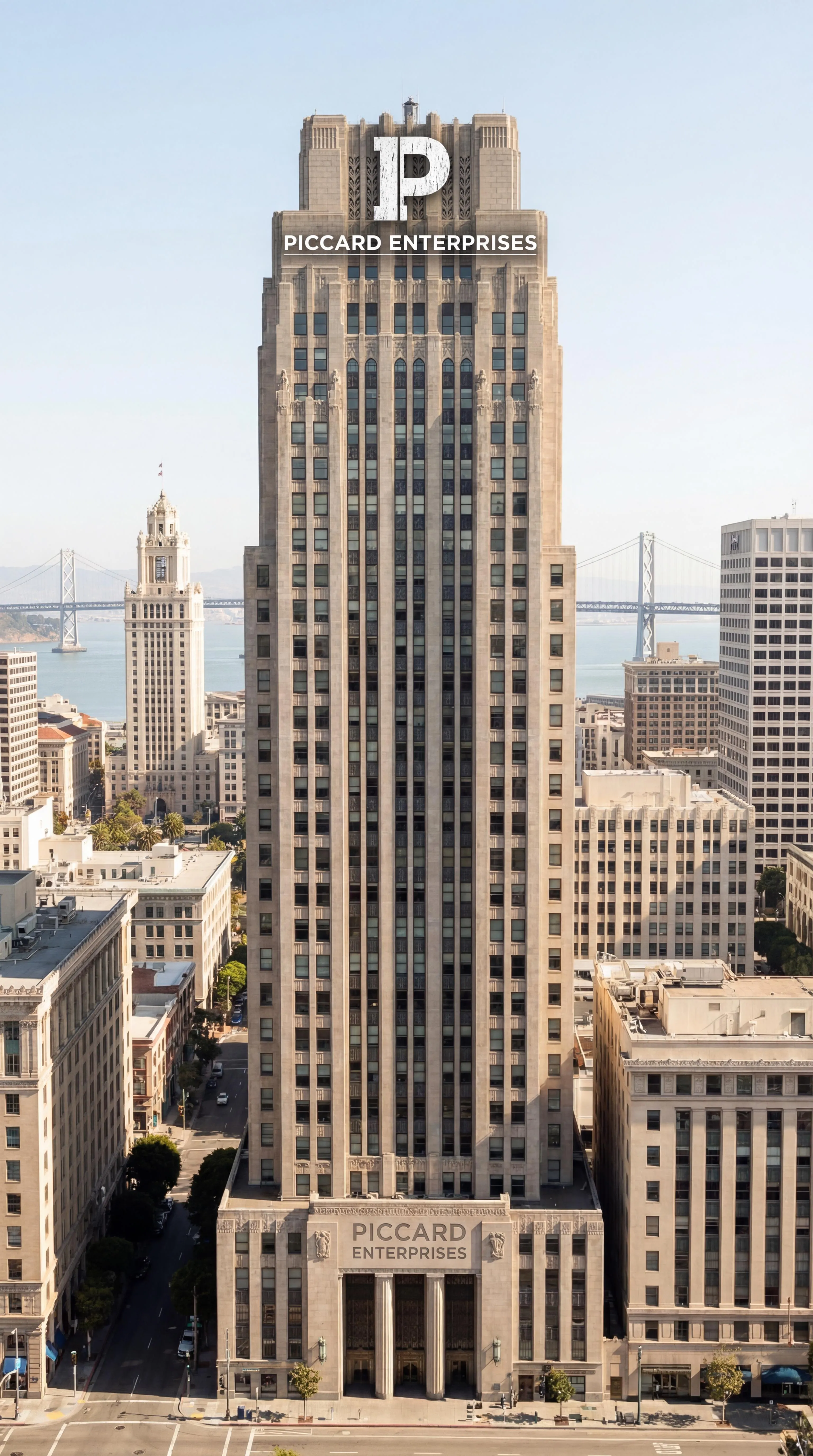 Generate an AI image of Wayne Tower from The Dark Knight Trilogy reimagined in Oakland, California, featuring Piccard Enterprises branding. Replace the iconic Wayne logo with custom Piccard signage using vivago.ai's advanced AI tools for professional visual content creation and editing.