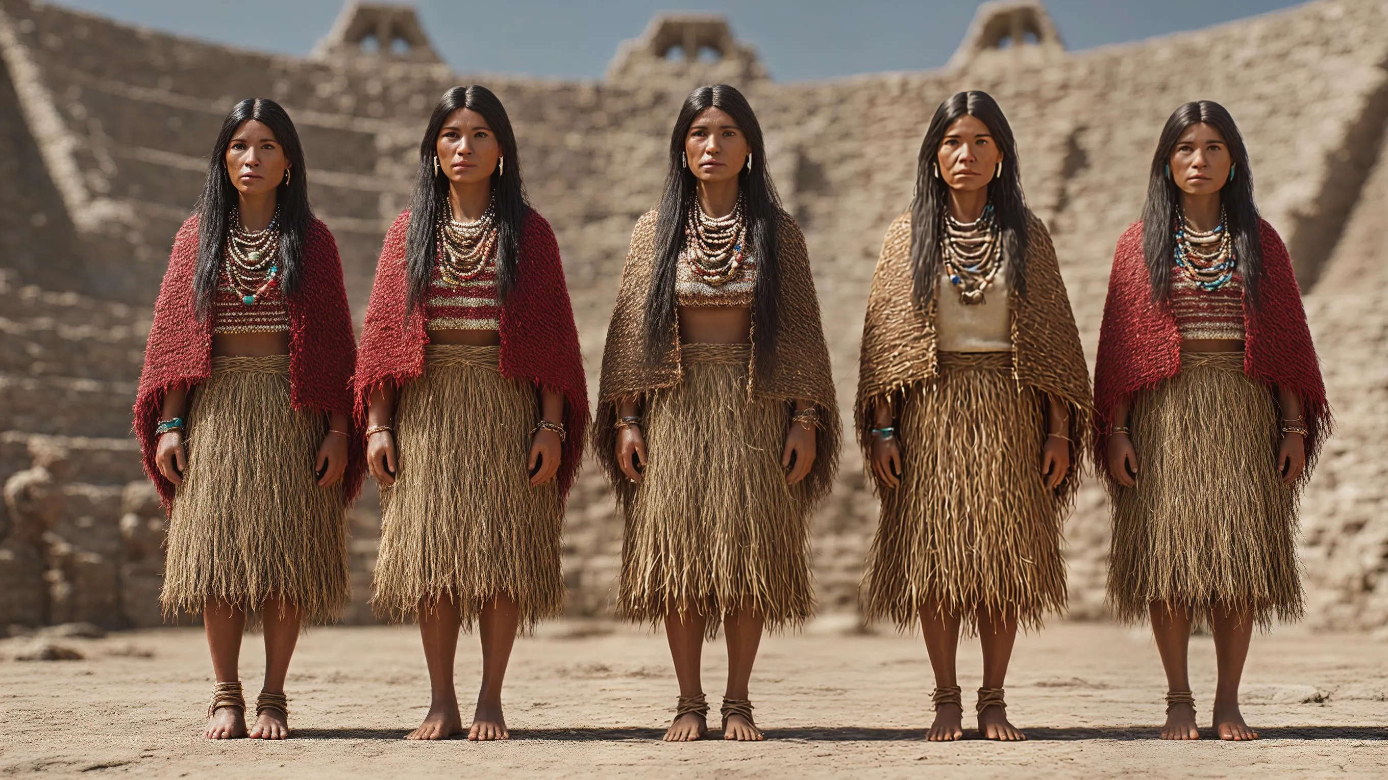 Ultra-photorealistic 8K still image showing five identical Caral-Supe women FULL BODY from head to feet, standing in perfect straight line formation facing viewer at edge of main sunken circular Plaza Mayor, authentic Norte Chico features (copper-brown skin, straight black hair, prominent cheekbones, sturdy Andean builds, dark expressive eyes). FULL BODY VIEW – Stable, archaeologically accurate organic-fiber clothing: Woven reed/grass skirts reaching mid-calf (completely visible), natural beige/brown tones Minimal llama wool chest bands (narrow horizontal bands across breasts) or reed shawls draped over shoulders Quipu cords (knotted counting strings) draped visibly over both shoulders Stone/quartz necklaces, llama bone hairpins, turquoise ear spools fully visible Bare feet completely visible on dusty plaza floor, NO cropped legs/feet Precise full-body group positioning (left to right, ALL feet visible): Tallest (5'6"): beige reed skirt + red llama band, largest quipu + stone necklace Medium (5'3"): brown grass skirt + beige shawl, bone hairpins both sides Center (5'2"): beige reed skirt + double quipu strands + shell necklace Medium (5'1"): red skirt + brown shawl, single large turquoise ear spool Shortest (4'11"): natural reed skirt + llama band, prominent bone hairpin FOREGROUND – Authentic archaeological objects (around visible feet): 15+ quipu bundles, reed flutes, cotton boll piles, llama bone tools, shicra bags DETAILED LIVELY BACKGROUND (50+ Caral-Supe people around Plaza Mayor): 15 MEN hauling 20kg shicra bags, carrying llama offerings 25 WOMEN grinding cotton seeds, weaving reed baskets, filling gourd vessels 12 CHILDREN playing with cotton boll toys, mini quipu cords PHOTOREALISTIC SETTING – Caral Sacred City (intact peak period): Golden hour over Plaza Mayor (100m diameter sunken circular plaza), surrounded by six earthen platform pyramids Dry desert terrace overlooking green Supe river valley (irrigated cotton fields) Circular stone amphitheaters, reed-thatched residences visible in background CRITICAL COMPOSITION: Full body framing: Heads at top 1/4, feet at bottom 1/8 of frame, NO CROPPING Perfect depth of field: razor-sharp full-body women + foreground objects, detailed populated background Natural skin texture (sunburn, windburn), reed weave visible, dust on completely visible bare feet