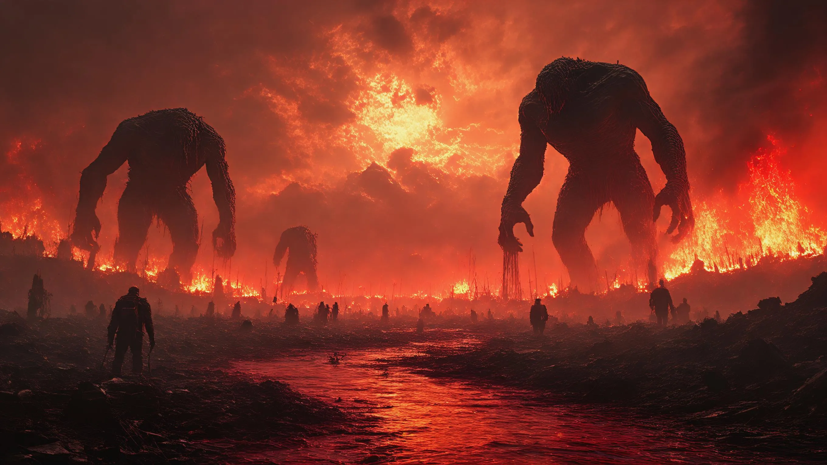 Generate apocalyptic AI art with vivago.ai. Create cinematic scenes of giants ruling a devastated world: burning landscapes, crushed cities, rivers of blood and ash. Dark mythological style, 16:9 scale. Transform text prompts into professional-grade visuals using AI image effects and editing tools.