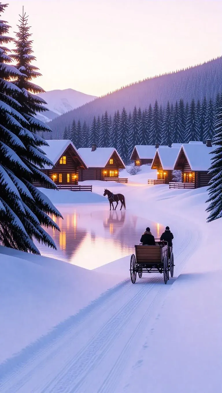 Create a serene AI-generated winter village scene with cozy snow-dusted cabins, glowing lights, and a pastel twilight sky mirrored on a frozen lake. Featuring minimalist details like a horse-drawn sleigh, frosted evergreens, and ample negative space for phone wallpaper. Ideal nostalgic vertical art blending muted tones with subtle mist for quiet winter ambiance.