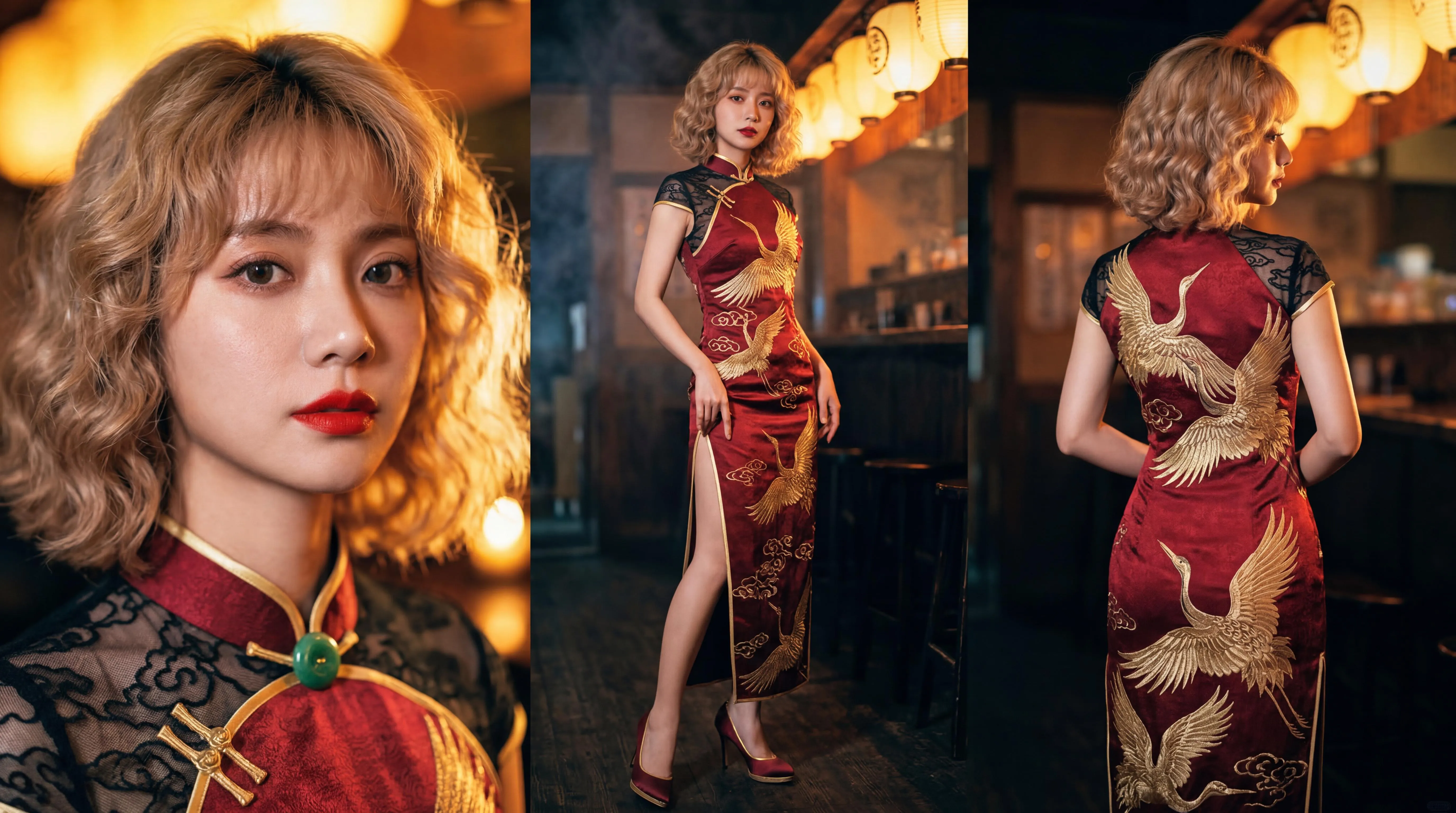 保持原图中女性角色的核心特征:金色波浪短卷发、深邃温婉的五官、饱和度高的朱红唇色。整体画质设定为8K超清写实摄影、电影级商业布光。 【旗袍细节微调(核心优化)】 材质: 选用重磅哑光真丝绸缎,底色为极具质感的深绯红(Deep Crimson)。 纹样: 旗袍主体采用金线浮雕绣工艺,图案为“仙鹤穿云”,金线需有明显的物理凸起感和金属折射光泽。 剪裁升级: 肩部两侧加入对称的黑色半透明云纹蕾丝镂空设计,展现微小的皮肤透感。 辅料: 领口与侧边的盘扣统一替换为圆润的帝王绿翡翠宝石,镶嵌金边;旗袍边缘(包括高开叉处)均采用金丝绸缎包边。 【结构化三格输出布局】 1. 左侧格:面部与领口特写 (Close-up Shot) 视角: 微距镜头,聚焦于面部至锁骨。 细节: 细腻的皮肤毛孔质感,眼神光聚焦。清晰展现翡翠盘扣的透光性与肩部蕾丝的纤维细节。背景为居酒屋暖黄灯火的极度虚化(Bokeh)。 2. 中间格:正面全身视图 (Full Body Front View) 视角: 平视全景。 细节: 角色呈现微侧身的优雅站姿,右手轻抚旗袍开叉处。金鹤纹样随身体曲线起伏,呈现出明暗交替的金属质感。脚穿一双金边点缀的绯红缎面高跟鞋。光影从右侧45度角打入,勾勒出曼妙的S型轮廓。 3. 右侧格:背面全身视图 (Full Body Back View) 视角: 背面1/4侧视。 细节: 重点刻画旗袍背部的收腰曲线与脊椎线条的起伏。背部完整展示一只展翅欲飞的金鹤刺绣,其羽毛纹路清晰可见。金色短发在颈部留下的阴影需符合物理光学,展现背部皮肤的细腻光泽。 【环境约束】 所有视图的背景统一设定为深夜日式居酒屋的朦胧氛围,以暖橙色和暗木色为基调,通过强烈的冷暖对比(人物肤色/金色发色 vs 暗色环境)增强视觉张力。