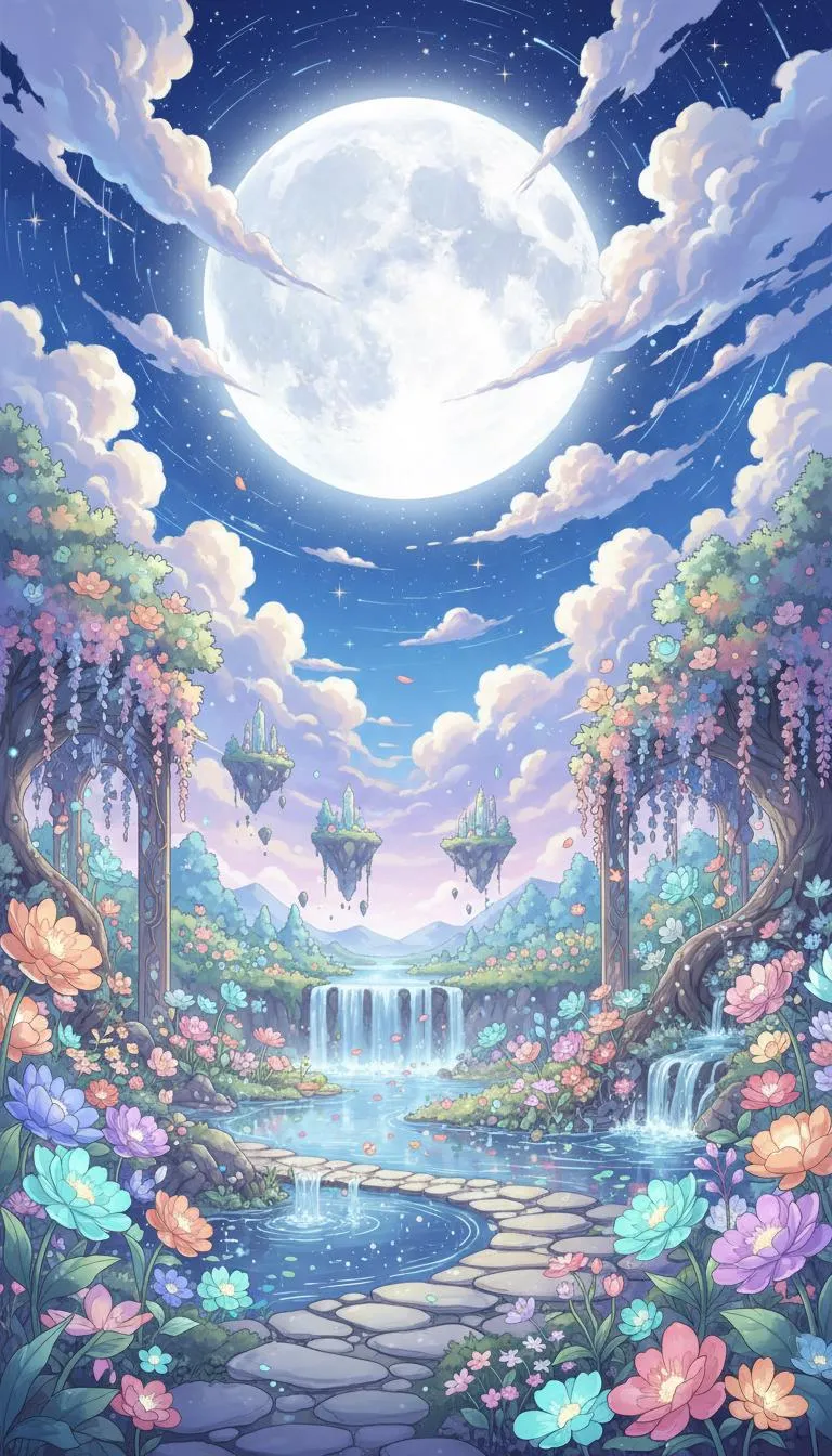 Create an enchanting anime fantasy night garden with our AI. Generate ultra-detailed scenes featuring a glowing moon, shining stars, floating clouds, luminous flowers, and a magical atmosphere. Experience stunning visuals rendered in soft pastel fantasy colors. Transform your vision into captivating AI art effortlessly.