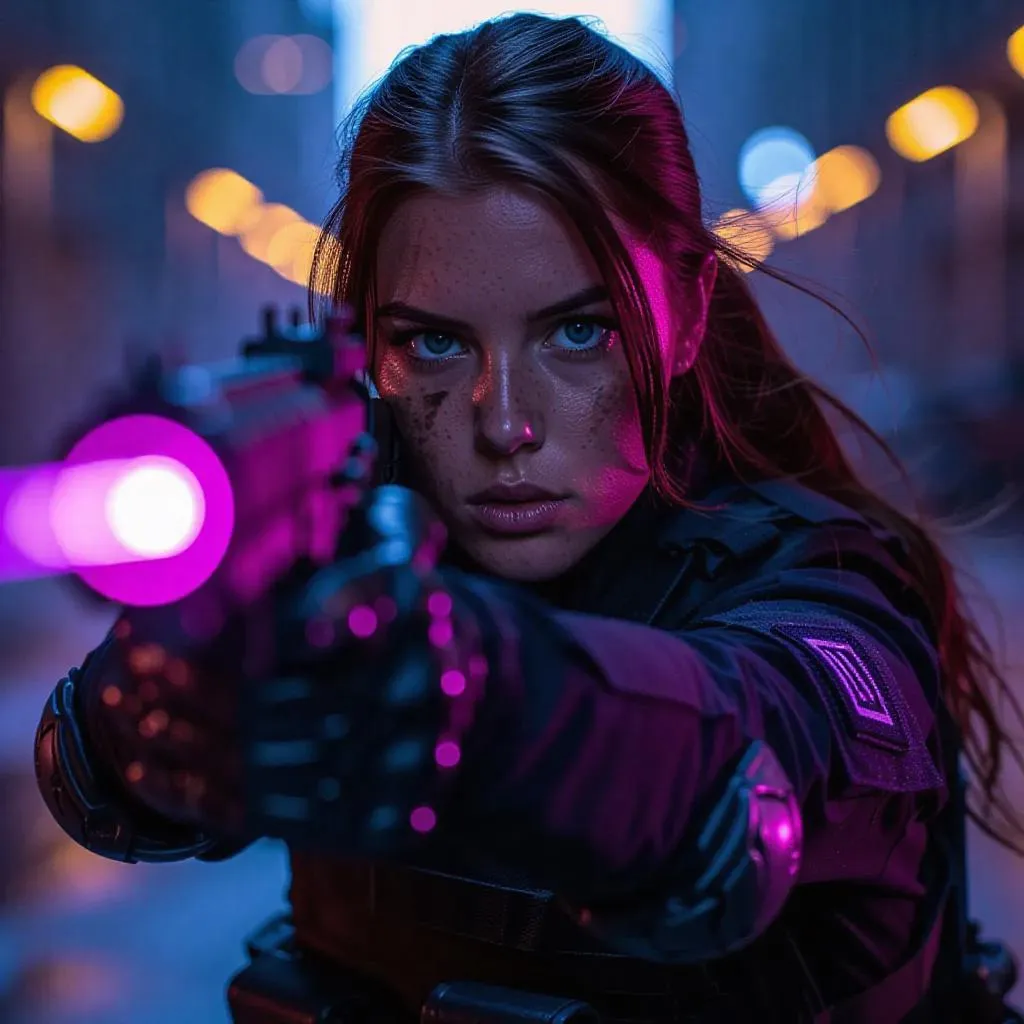 AI-generated image of a bold Canadian army heroine with electric-blue eyes, chestnut-brown hair, and a futuristic violet ray gun emitting amethyst energy blasts. Create vivid, action-packed visuals with Vivago.ai's AI tools for dynamic character designs and sci-fi scenes. Perfect for storytelling, gaming, or digital art projects.