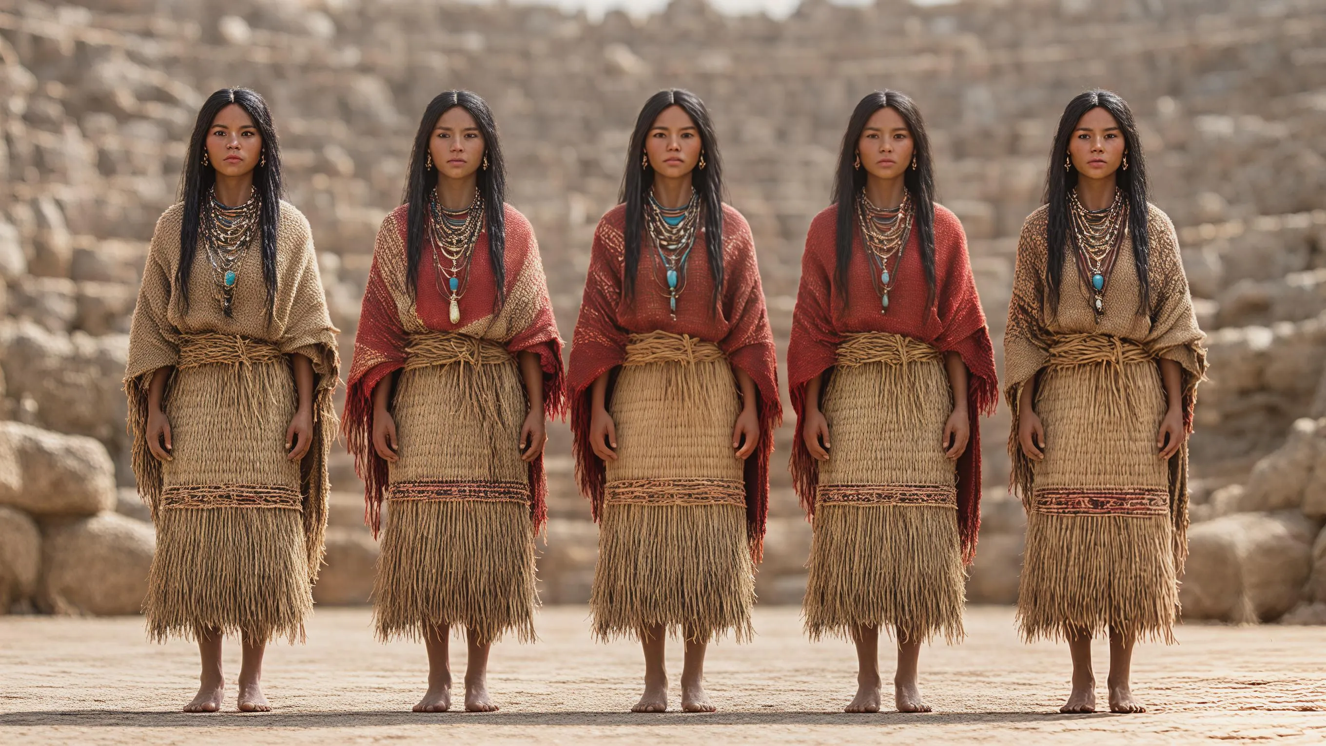 Ultra-photorealistic 8K still image showing five identical Caral-Supe women FULL BODY from head to feet, standing in perfect straight line formation facing viewer at edge of main sunken circular Plaza Mayor, authentic Norte Chico features (copper-brown skin, straight black hair, prominent cheekbones, sturdy Andean builds, dark expressive eyes). FULL BODY VIEW – Stable, archaeologically accurate organic-fiber clothing: Woven reed/grass skirts reaching mid-calf (completely visible), natural beige/brown tones Minimal llama wool chest bands (narrow horizontal bands across breasts) or reed shawls draped over shoulders Quipu cords (knotted counting strings) draped visibly over both shoulders Stone/quartz necklaces, llama bone hairpins, turquoise ear spools fully visible Bare feet completely visible on dusty plaza floor, NO cropped legs/feet Precise full-body group positioning (left to right, ALL feet visible): Tallest (5'6"): beige reed skirt + red llama band, largest quipu + stone necklace Medium (5'3"): brown grass skirt + beige shawl, bone hairpins both sides Center (5'2"): beige reed skirt + double quipu strands + shell necklace Medium (5'1"): red skirt + brown shawl, single large turquoise ear spool Shortest (4'11"): natural reed skirt + llama band, prominent bone hairpin FOREGROUND – Authentic archaeological objects (around visible feet): 15+ quipu bundles, reed flutes, cotton boll piles, llama bone tools, shicra bags DETAILED LIVELY BACKGROUND (50+ Caral-Supe people around Plaza Mayor): 15 MEN hauling 20kg shicra bags, carrying llama offerings 25 WOMEN grinding cotton seeds, weaving reed baskets, filling gourd vessels 12 CHILDREN playing with cotton boll toys, mini quipu cords PHOTOREALISTIC SETTING – Caral Sacred City (intact peak period): Golden hour over Plaza Mayor (100m diameter sunken circular plaza), surrounded by six earthen platform pyramids Dry desert terrace overlooking green Supe river valley (irrigated cotton fields) Circular stone amphitheaters, reed-thatched residences visible in background CRITICAL COMPOSITION: Full body framing: Heads at top 1/4, feet at bottom 1/8 of frame, NO CROPPING Perfect depth of field: razor-sharp full-body women + foreground objects, detailed populated background Natural skin texture (sunburn, windburn), reed weave visible, dust on completely visible bare feet