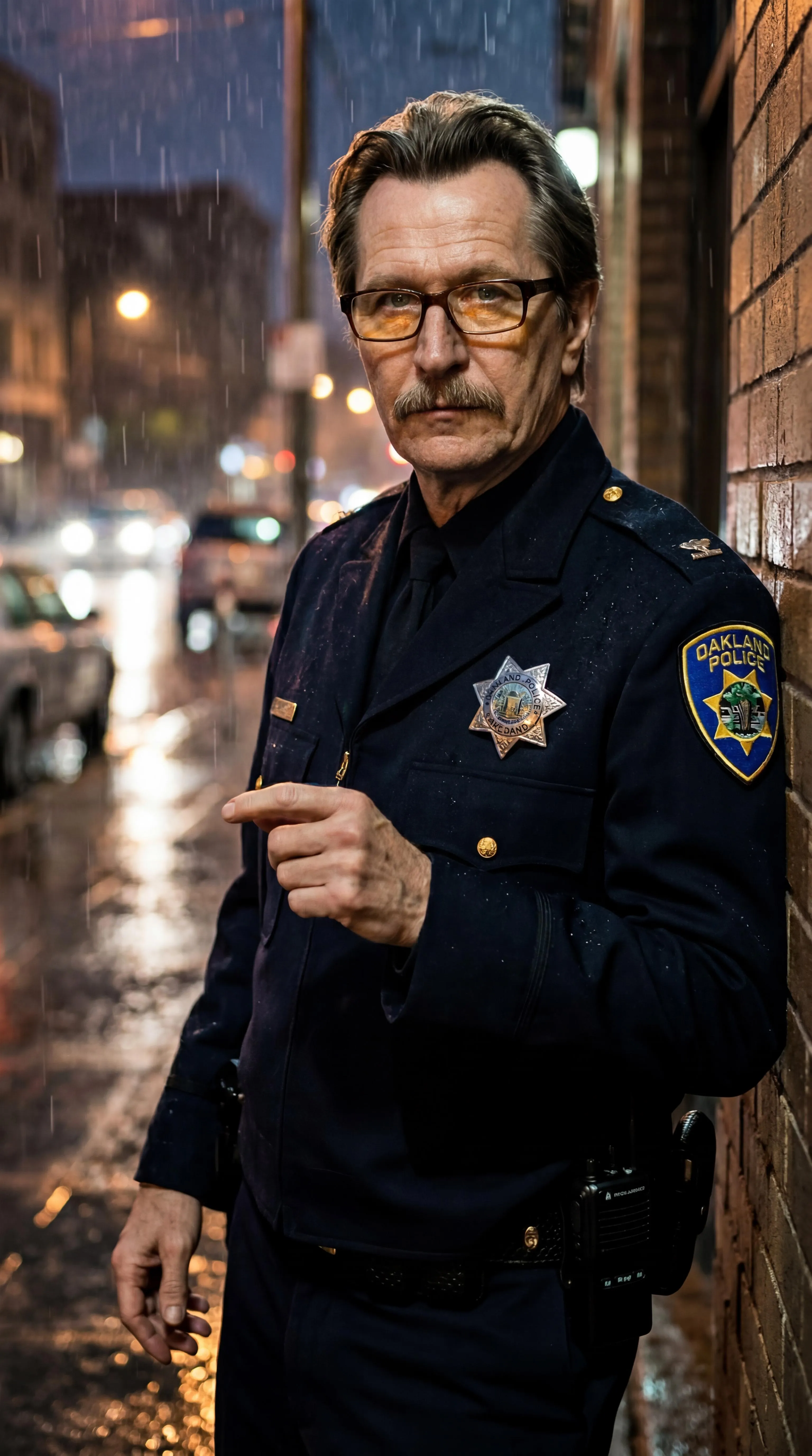 New York Police Department captain George Stacy (portrayed by James Cromwell) and Gotham Police Department Commissioner Jim Gordon (portrayed by Gary Goldman) interchangeably combine together into each other as one, facial and physical features alike. The NYPD badge on Stacy's uniform and the GCPD badge on Gordon's uniform are both replaced with the Oakland Police Department badge. No sensitive information or guidelines violating content seen or involved.