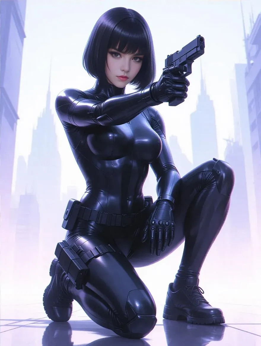 Generate ultra-detailed cyberpunk AI art: Asian woman in tactical gear aims a pistol with red laser in futuristic Tokyo. Ghost in the Shell-inspired scene with cinematic lighting, hyper-realistic anatomy, and 8K absurdres quality. Experience industrial-mechanical precision and neo-noir visuals with this dystopian masterpiece.