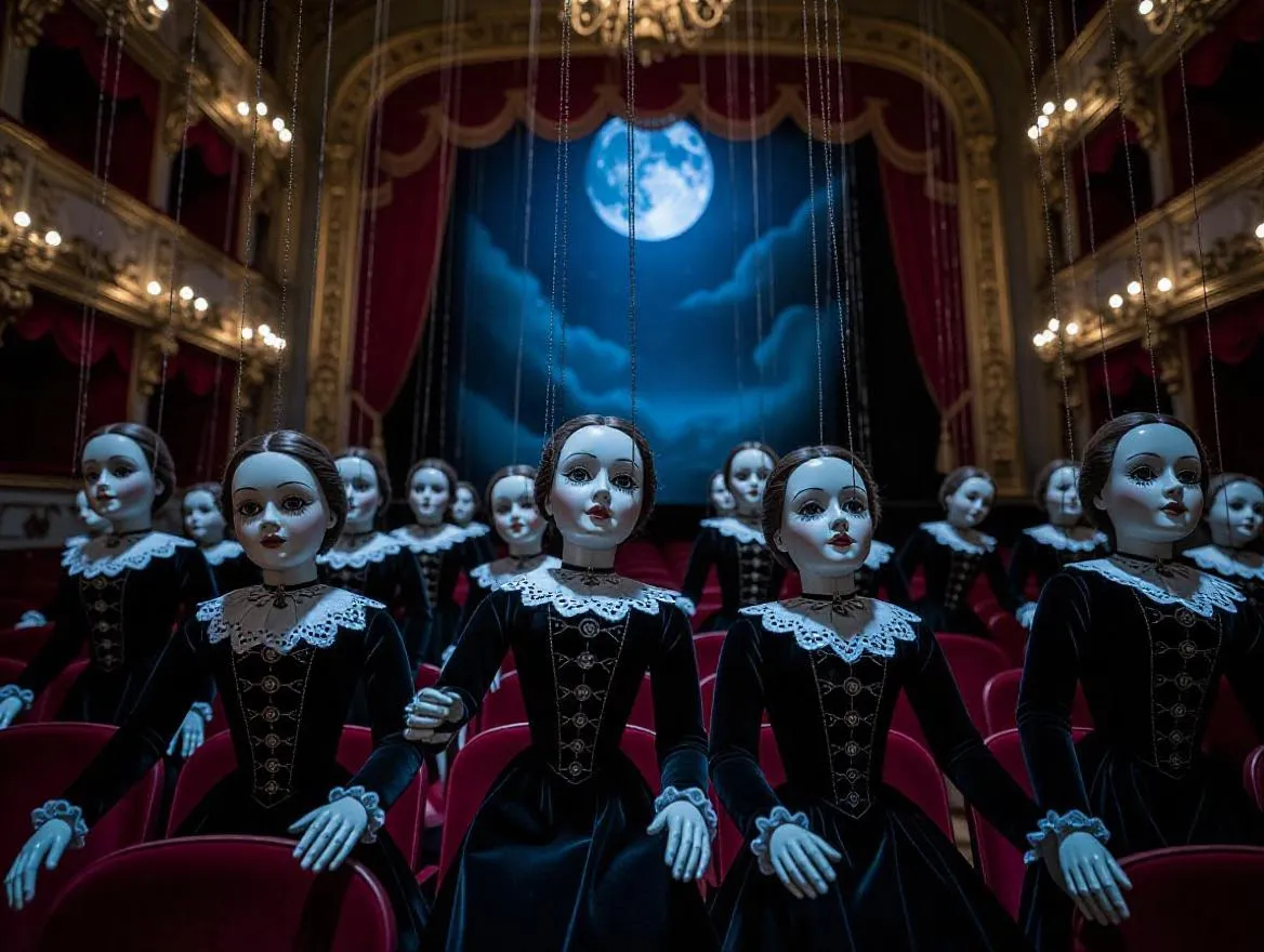 A moonlit derelict opera house filled with weathered marionettes frozen mid-performance. Elaborate puppets with ivory-carved faces, cracked jeweled eyes, and tattered velvet robes hang from tarnished silver strings, limbs contorted in tragic poses. Pale blue light spills through shattered stained glass, casting kaleidoscopic shadows across rotting velvet seats and a stage littered with broken music boxes. A spectral puppetmaster's faded portrait glows faintly above the proscenium, hollow eyes controlling the dance as cobweb-covered chandeliers sway silently. Ultra-detailed textures: moth-wing lace collars, oxidized copper joints, and clockwork hearts visible through cracked chests. Cinematic low-angle framing emphasizing towering marionettes against arched ceilings, cold moonlight blending with flickering candle remnants for haunting chiaroscuro.