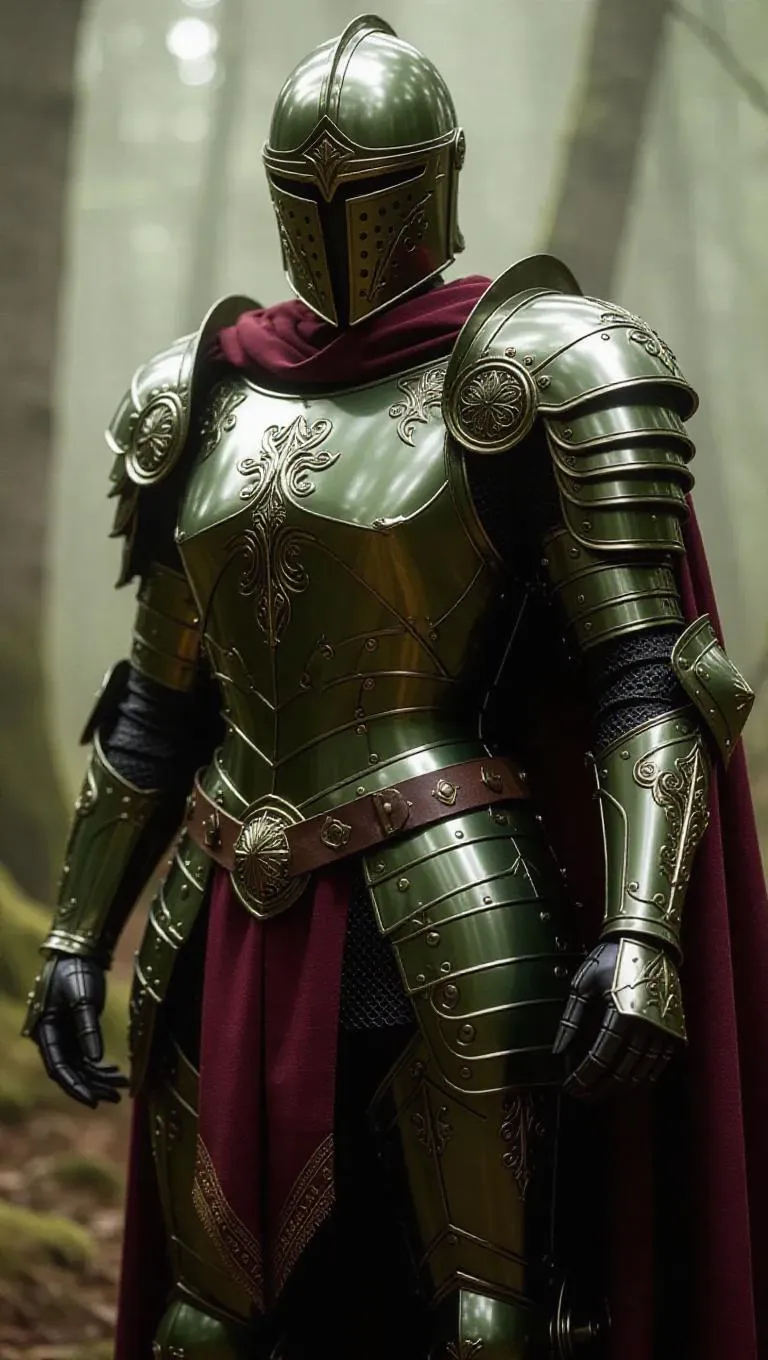 Craft elite AI-generated knight armor with intricate olive green engravings, blending strength and elegance. Set in a misty forest, featuring a red Roman-style cape, versatile hook-shot weapon, and shimmering energy shield. Perfect for dynamic battle suits. Design striking visuals effortlessly with vivago.ai's AI-powered tools for professional-grade, imaginative results.
