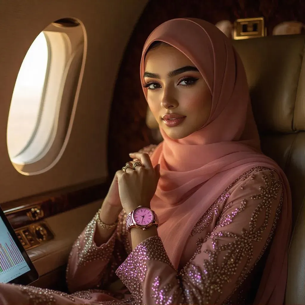 Empowering AI-generated image of a billionaire Muslim teen in luxury modest fashion: elegant designer hijab, golden sunset-lit private jet interior, sleek business tablet & designer handbag. Soft-glow makeup, pink watch accents her visionary gaze—symbolizing youthful intelligence, wealth, and entrepreneurial ambition. Perfect for modern modest style inspiration and success-driven visual storytelling.