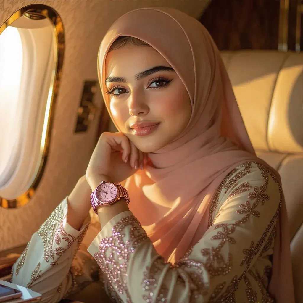 Empowering AI-generated image of a billionaire Muslim teen in luxury modest fashion: elegant designer hijab, golden sunset-lit private jet interior, sleek business tablet & designer handbag. Soft-glow makeup, pink watch accents her visionary gaze—symbolizing youthful intelligence, wealth, and entrepreneurial ambition. Perfect for modern modest style inspiration and success-driven visual storytelling.