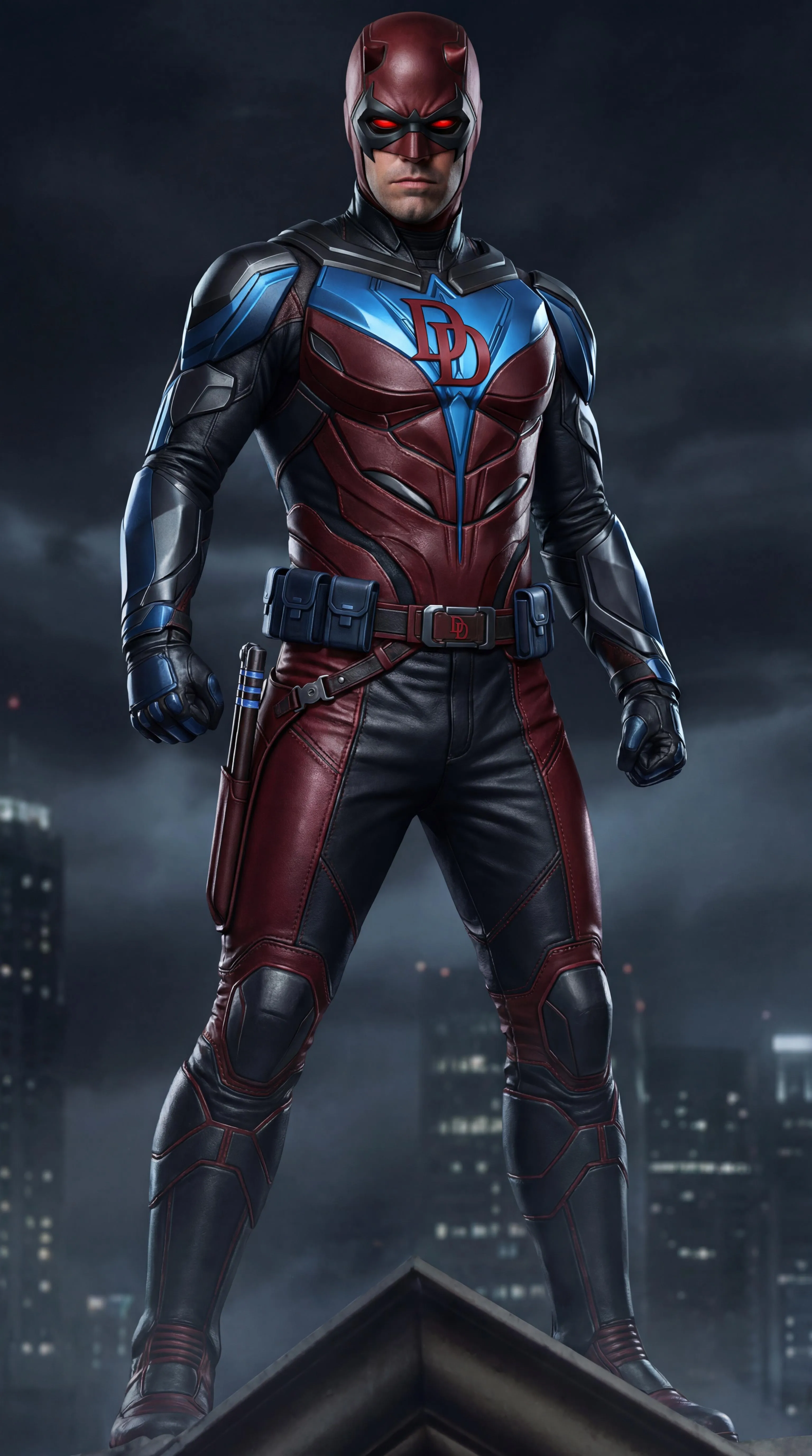 Generate the ultimate Nightdevil superhero fusion! This AI-powered mashup combines Nightwing's blue/black suits with Daredevil's red/black costumes. Features a unique head-covering mask blending both heroes, overlapping chest logos, and a combined utility belt. Create striking superhero fusions with vivago.ai's AI tools.