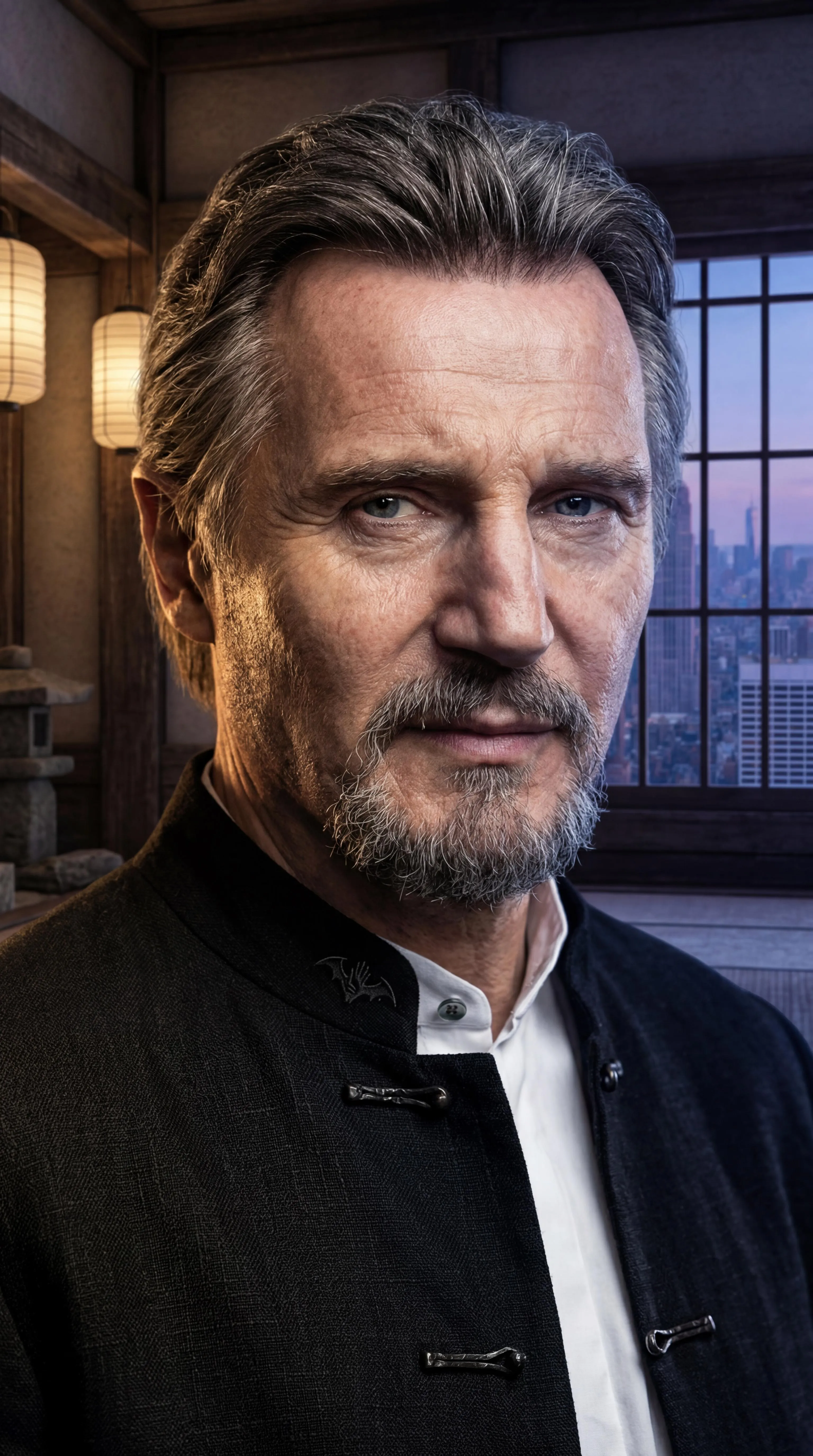 Kagenobu "Nobu" Yoshioka (portrayed by Peter Shinkoda) from the Marvel Cinematic Universe and Ra's al Ghul (portrayed by Liam Neeson) from The Dark Knight Trilogy interchangeably combine together into each other as one, facial and physical features and outfits alike. No sensitive information or guidelines violating content seen or involved.