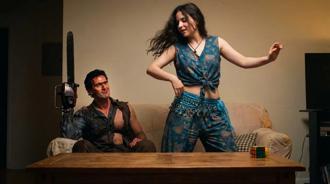 Make the girl dancing tsifteteli for Ash on the table