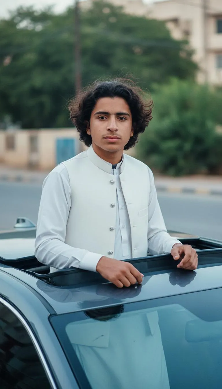 Generate hyper-realistic cinematic portraits with AI. Create an 18-year-old boy standing through a Honda Civic sunroof, wearing a tailored shalwar kameez and waistcoat. Features intense wind-blown hair, cinematic cool lighting, realistic skin glow, and Rolleiflex film aesthetics. Perfect DSLR-quality 8K images with shallow depth of field. Transform your vision into professional-grade AI art.