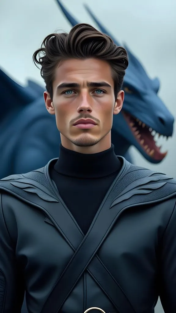 A young man stood confidently in front of a huge blue dragon. He was wearing a black leather jacket with a high collar and a belt tied around his waist. His hair was combed in a swept back style, and his gaze turned to one side with a serious expression on his face. The dragon behind him is impressive, with large wings spread out, seeming to roar or spew smoke.