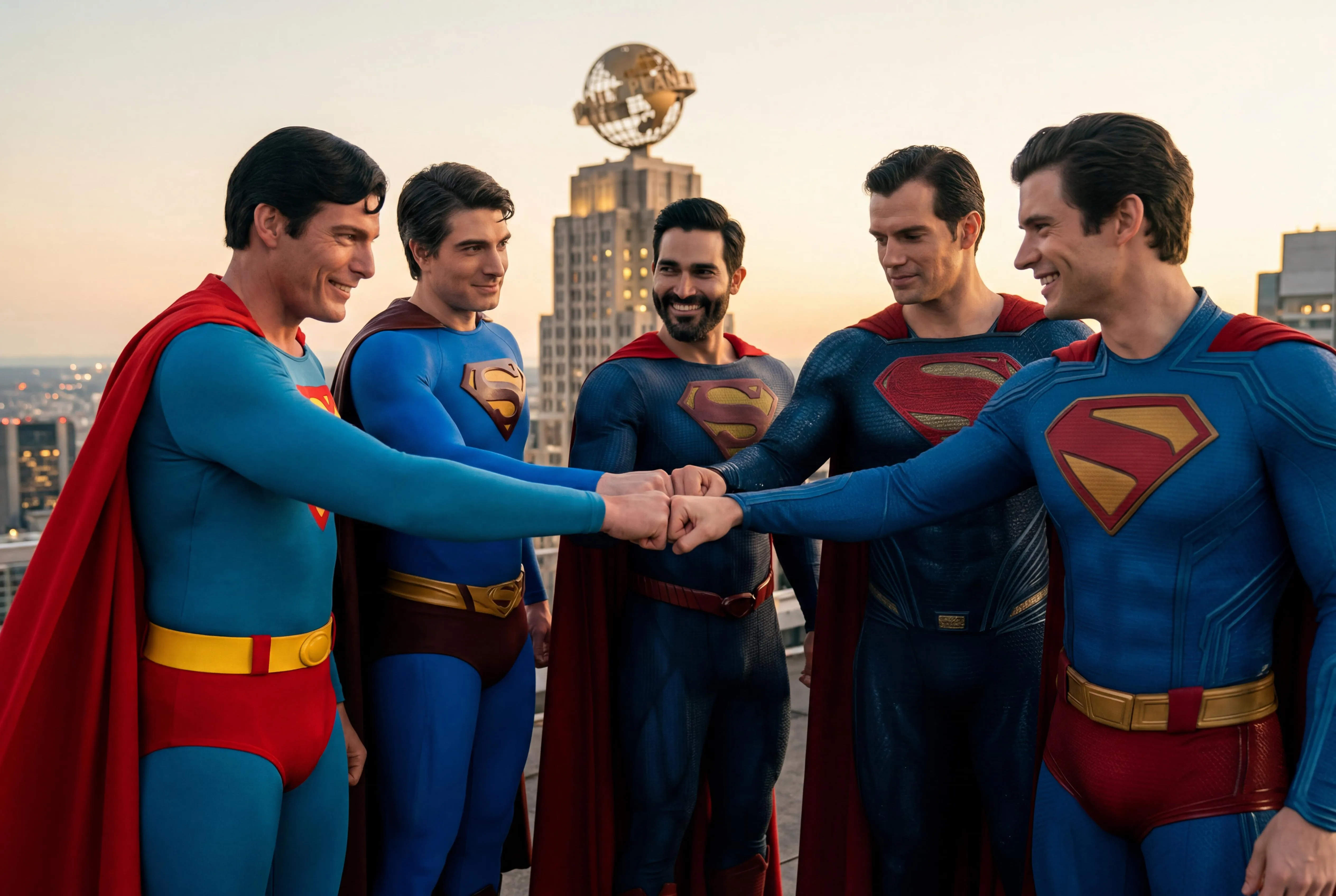 Superman (portrayed by Christopher Reeve and Brandon Routh, Tyler Hoechlin, Henry Cavill, and David Corenswet) share a knuckle bump together.