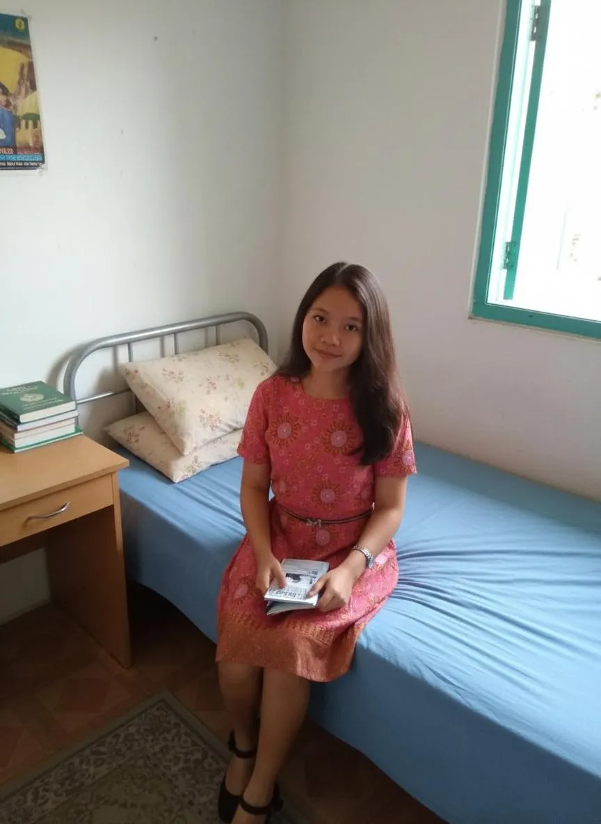 Generate AI images of a woman sitting on a bed in a simple boarding room. Maintain her exact facial features with no alteration. Create an overhead, close-up photo view using text prompts. Vivago.ai transforms your scene descriptions into precise visuals instantly. Professional AI photo generator tool.