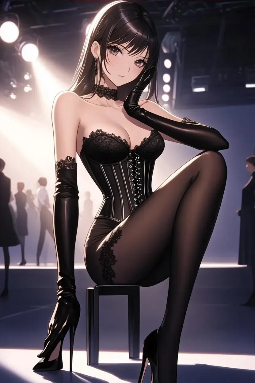 Generate AI-powered anime fashion art with vivago.ai. Transform prompts into high-fashion visuals: black lace corset dresses, opera gloves, and glinting heels under studio lighting. Perfect for creating elegant anime models in glamorous runway scenes, blending AI creativity with professional-grade image generation for stunning results.