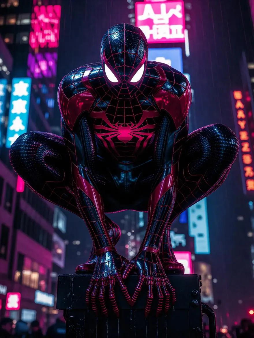 Biomech Spider-Man fused with his suit: glossy black exoskeleton, crimson pulsing armor plates, four whirring hydraulic legs erupting from his spine, anguished human head with glowing green veins from neural interface fluid. Perched atop a neon-drenched cyberpunk skyscraper, acid rain slashing across twitching mechanical limbs. Abdominal section sprouts organic spinnerets dripping corrosive webbing. Nightmarish blend of bleeding-edge tech and arachnid biology, backlit by holographic ads for forbidden body modifications.