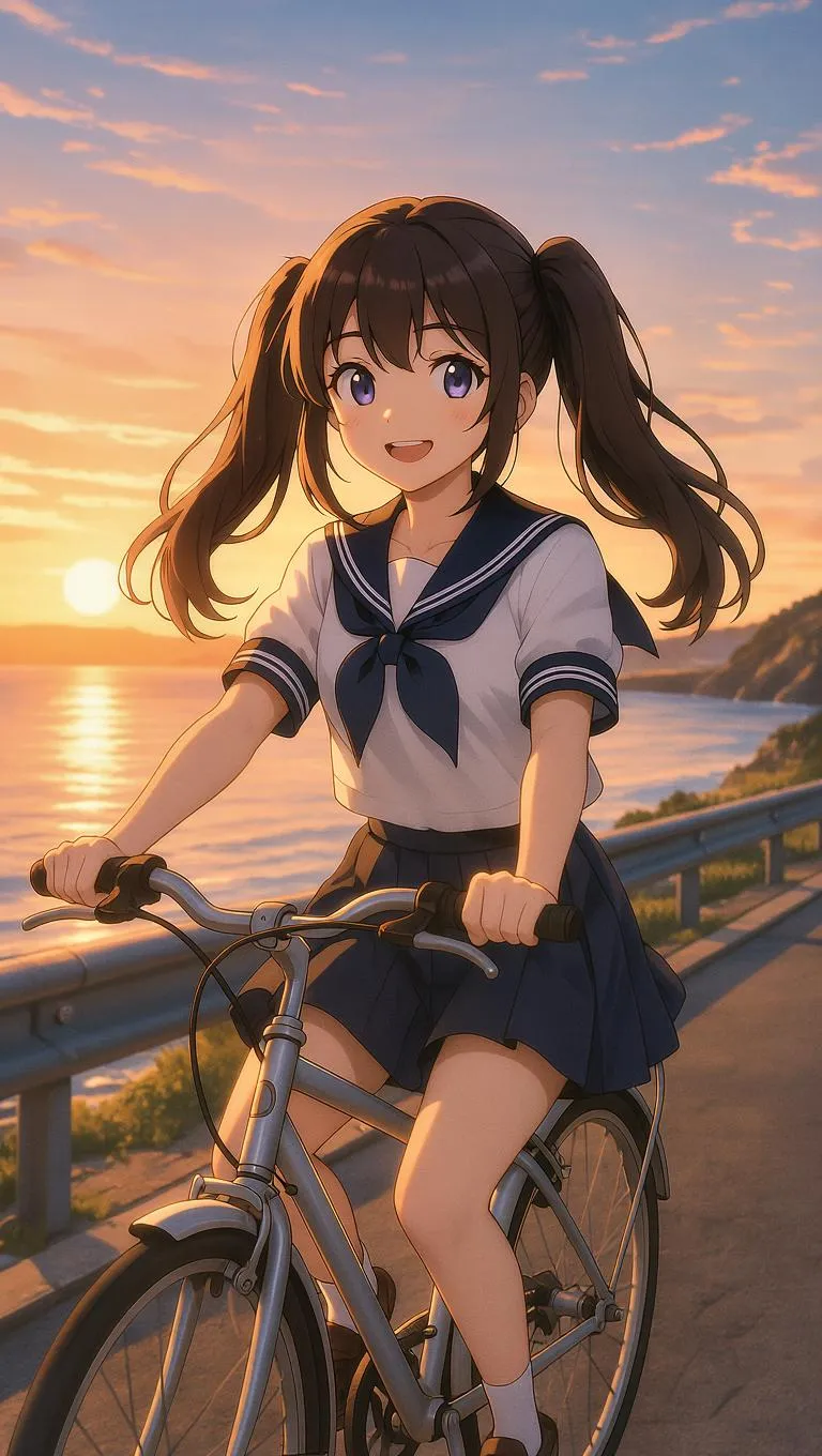 全景,一个德国混血的漂亮女孩,双马尾造型,穿着日系JK制服,骑着自行车沿着海边公路前行。夕阳洒在她的脸上,海风吹起她的头发,画面温暖、轻柔、治愈。她脸上带着放松的微笑,背景是闪耀着阳光的海面。整体画面具有电影般的质感和夏日的怀旧气息。
