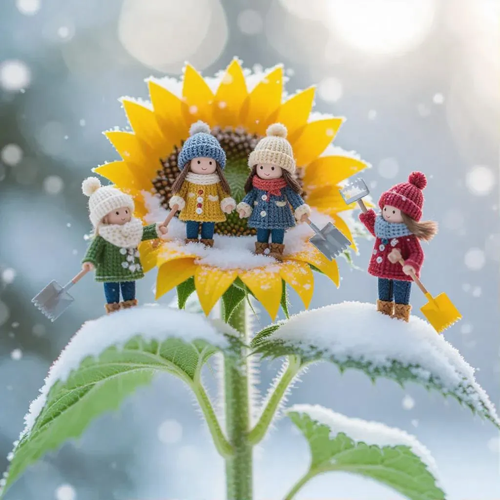 Experience AI-generated miniature winter scenes with cozy figures clearing snow from a frosty sunflower. This magical wonderland art blends intricate natural details with warmth and compassion. Create unique winter vistas using vivago.ai's AI art tool for stunning visual creation.
