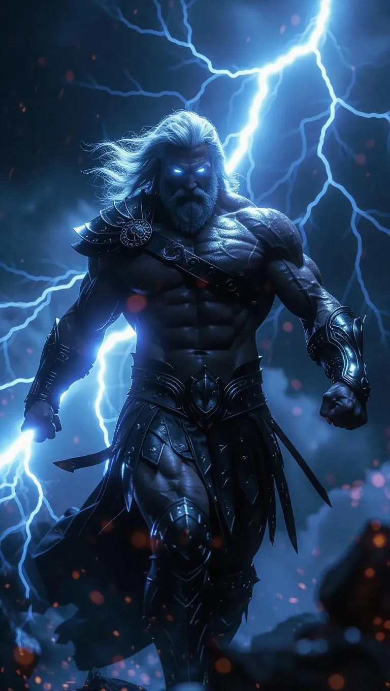 Generate epic AI art of a divine storm god in thunder-forged armor, wielding lightning energy. Capture cinematic Olympus scenes with glowing eyes, silver hair, and crackling bolts. Perfect for mythic visuals, powerful deity imagery, and dramatic storm-themed AI-generated art with cinematic lighting effects.