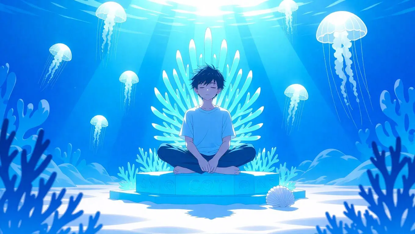 Generate a serene anime scene with AI: a meditative boy on a luminous coral throne amidst bioluminescent fish, drifting jellyfish, and sunlit underwater ruins. Rendered in soft watercolor tones, Ghibli-inspired oceanic wonder, and cinematic details like pearlescent sand seashell crown. Perfect for anime art, dreamlike visuals, and AI-generated watercolor storytelling with vivago.ai's creative tools.