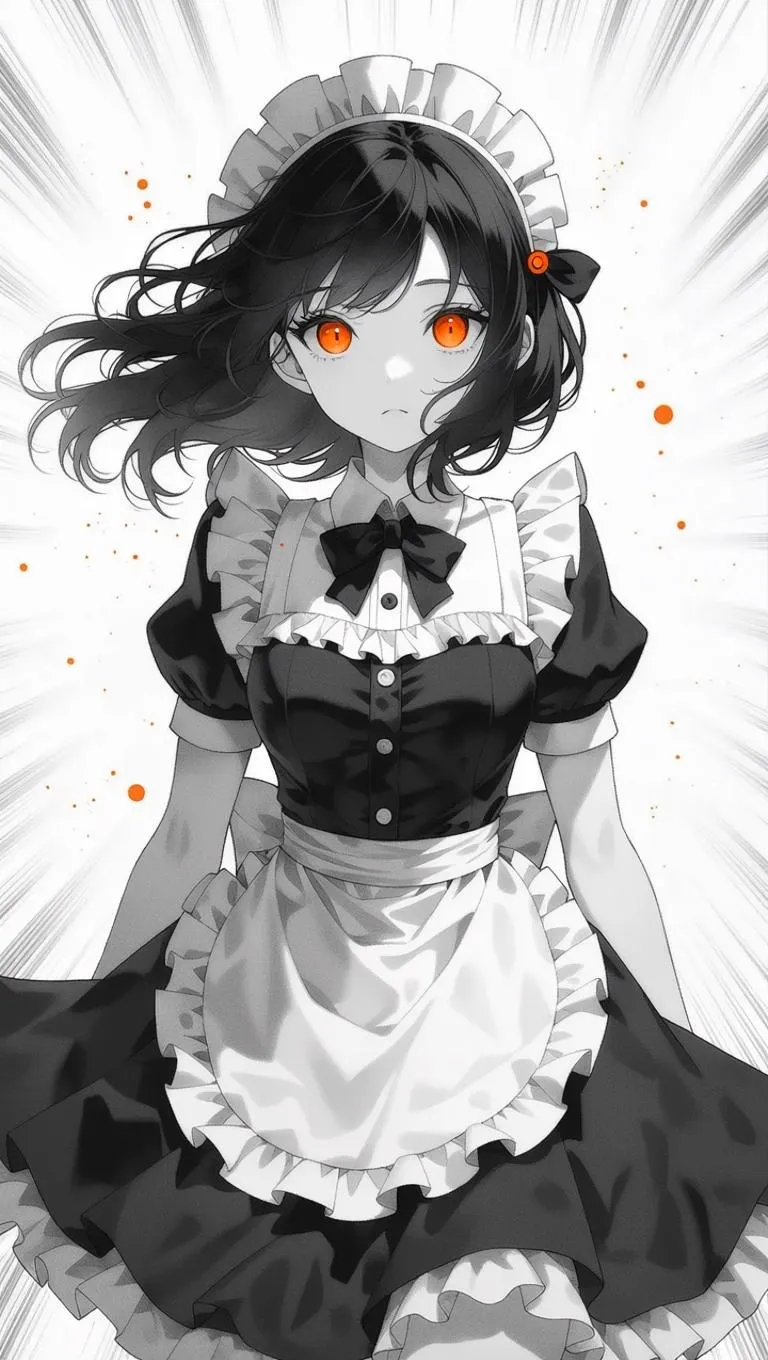 Create a mysterious manga-style maid with glowing orange eyes & explosive effects using vivago.ai. Monochrome palette with vibrant orange accents. Generate dynamic anime characters featuring speed lines, splash effects, dramatic lighting, and traditional black/white maid attire. Free AI art tools for vivid illustrations.