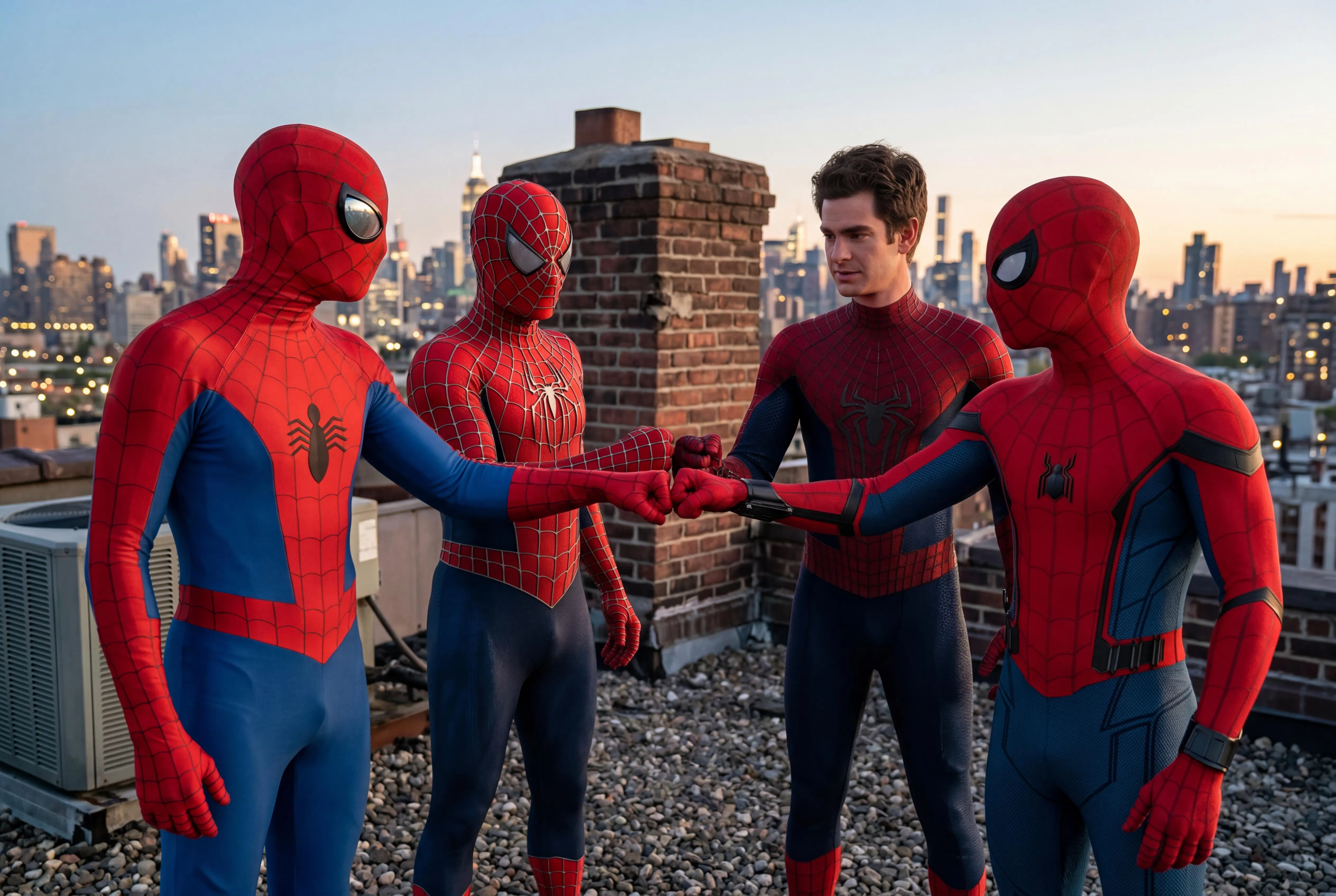 Spider-Man (portrayed by Nicholas Hammond, Tobey Maguire, Andrew Garfield, and Tom Holland) share a knuckle bump together.