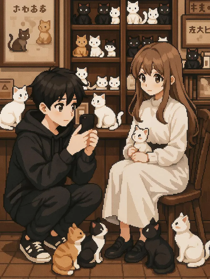 像素风格插画 ,猫咖场景,日式动漫脸,男孩蹲着拿手机记录女孩,女孩坐着抱着小猫, 男孩身着黑色衣物,女孩身着白色衣物 女孩被小猫们喜欢所以周围有很多小猫 女孩是长发 男孩清秀高冷