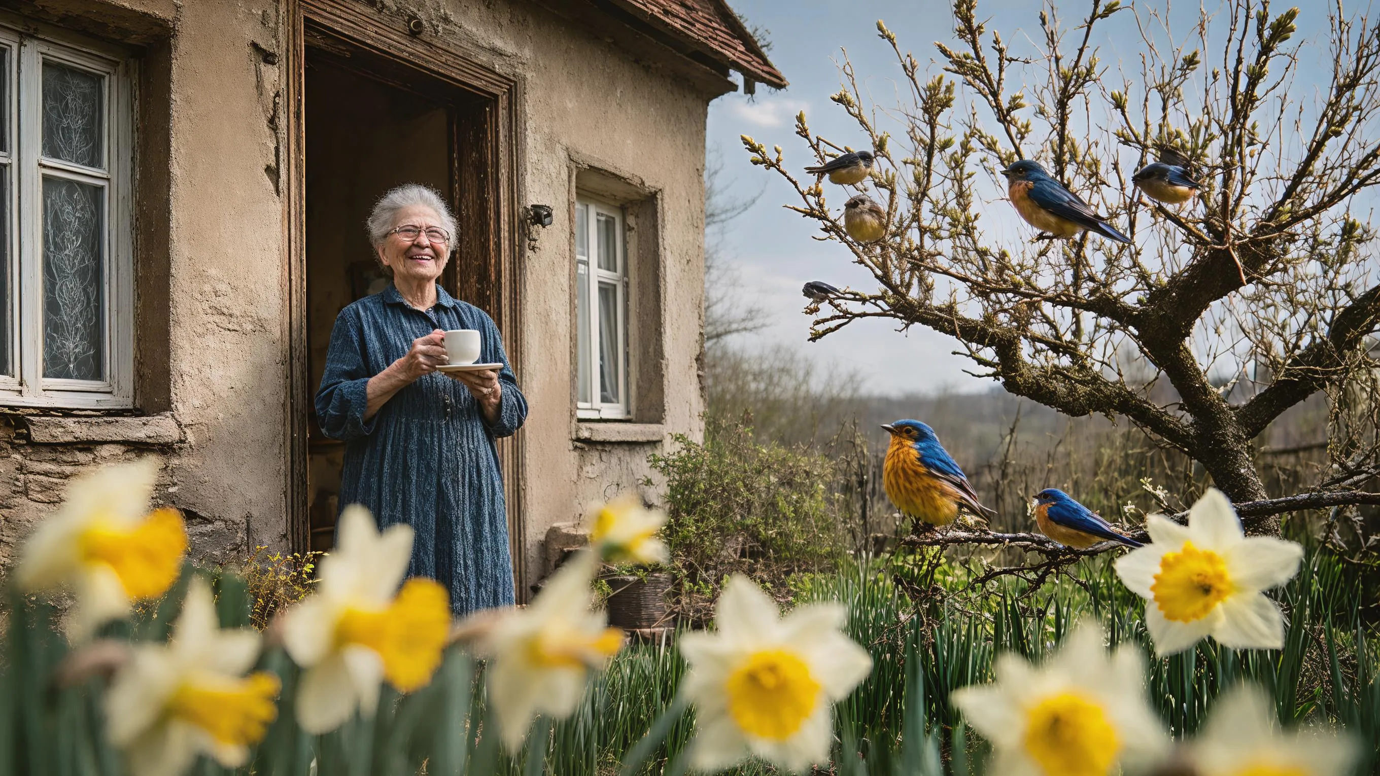 Create vivid AI images of an elderly woman smiling on a Hungarian village porch, holding coffee. Visualize blooming daffodils, budding fruit trees, and bluebirds perched on branches. Generate this serene spring scene instantly with vivago.ai's professional AI art tools for stunning, lifelike results.