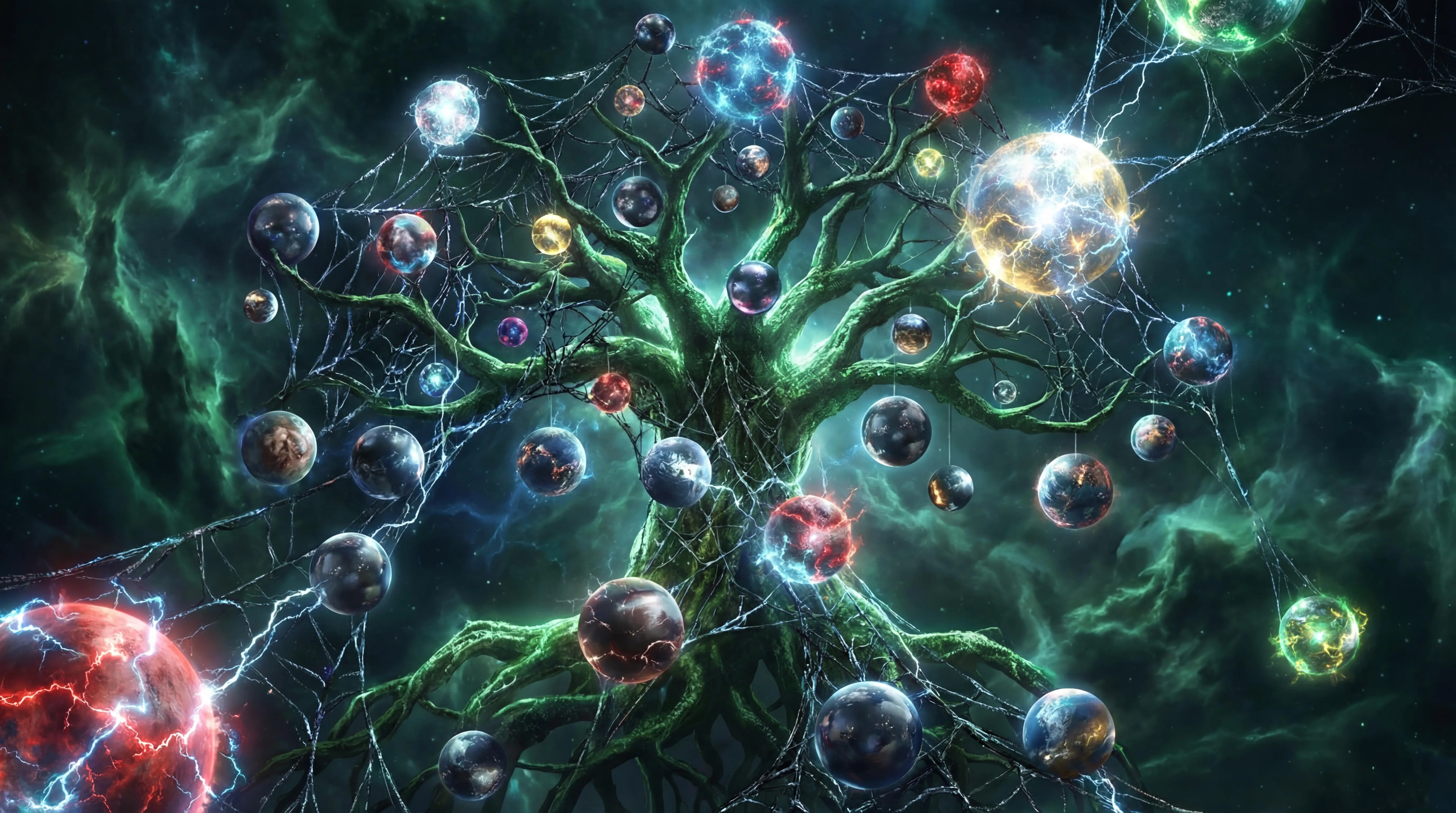Explore AI-generated visuals merging Marvel, DC, Arrowverse, and Spider-Verse multiverses. See SSU's webs entwine with MCU's branches, Arrowverse's spheres fuse with DCEU's orbs. Create stunning multicolored, web-tree branched dimensional concepts. Generate this iconic cosmic convergence using AI art tools. No people. (47 words)