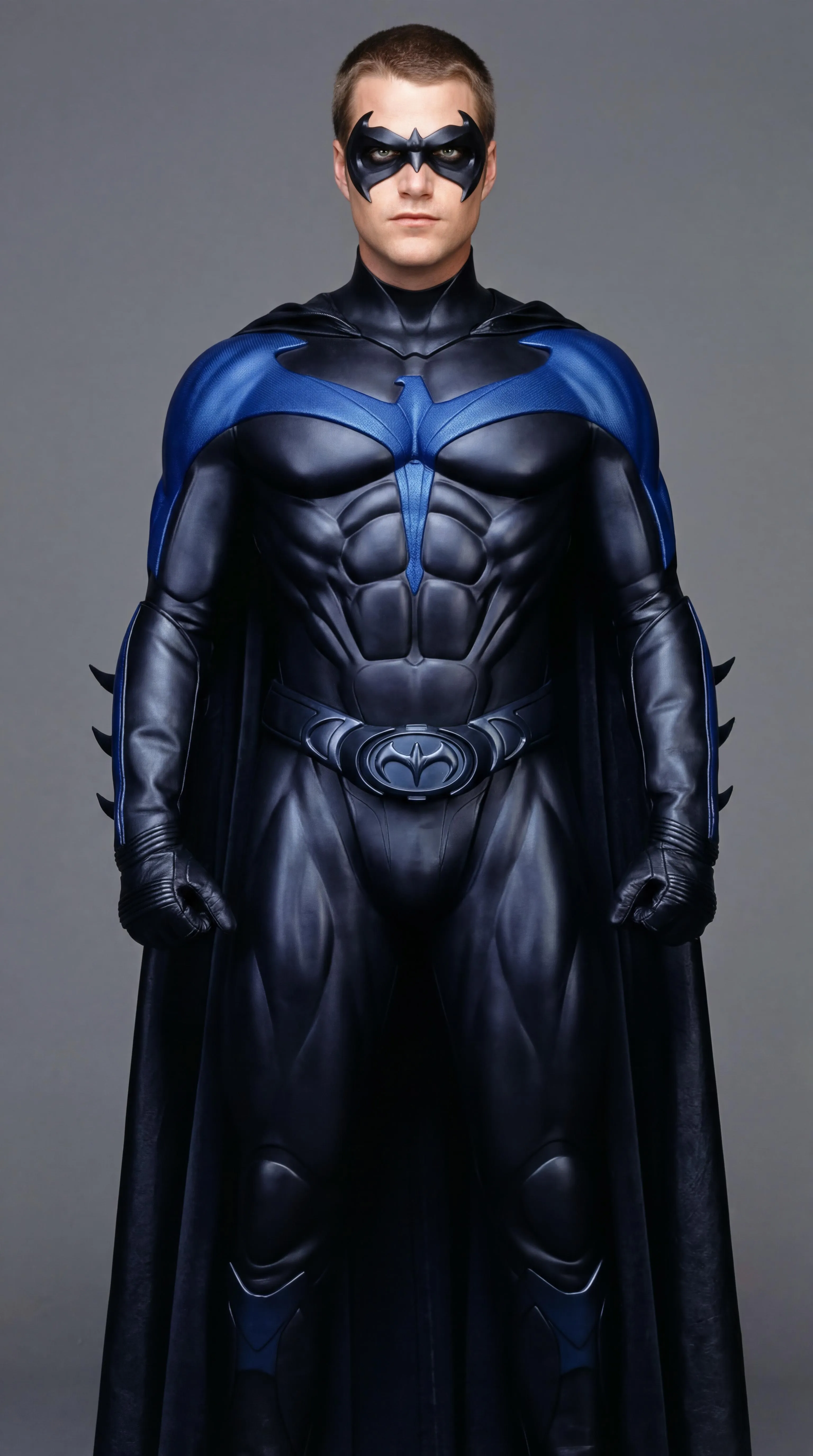 Nightwing's suit is black, and the red logo extending down its chest and arms is blue. The nipples seen on the exterior of the suit are not present. No sensitive information or guidelines violating content seen or involved.