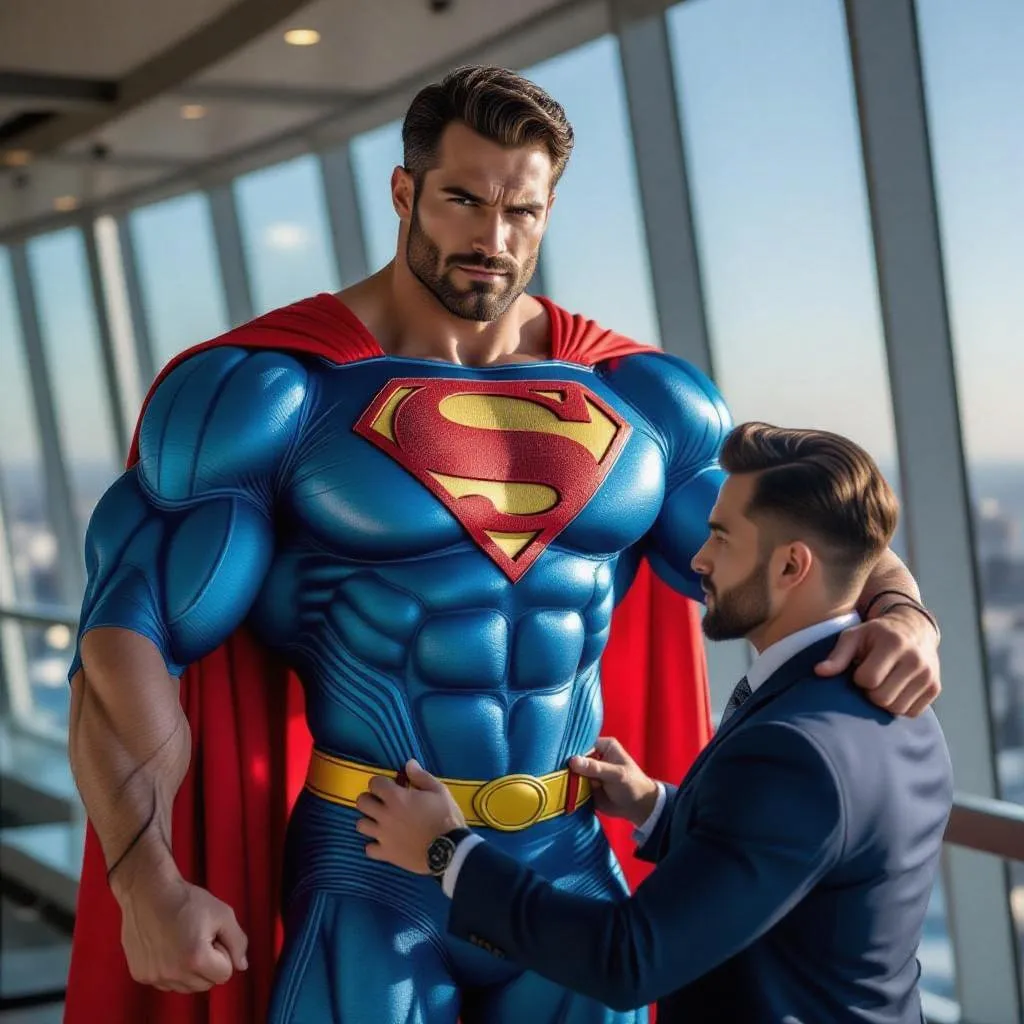 Generate AI superhero images of a muscular bodybuilder in a vibrant Superman-like costume. Create dynamic shots with dramatic lighting, showcasing chiseled physique and confident poses. Features custom superhero suit design with tailor details. Perfect AI art for heroic character concepts and comic-inspired visuals. Explore cinematic superhero transformations.