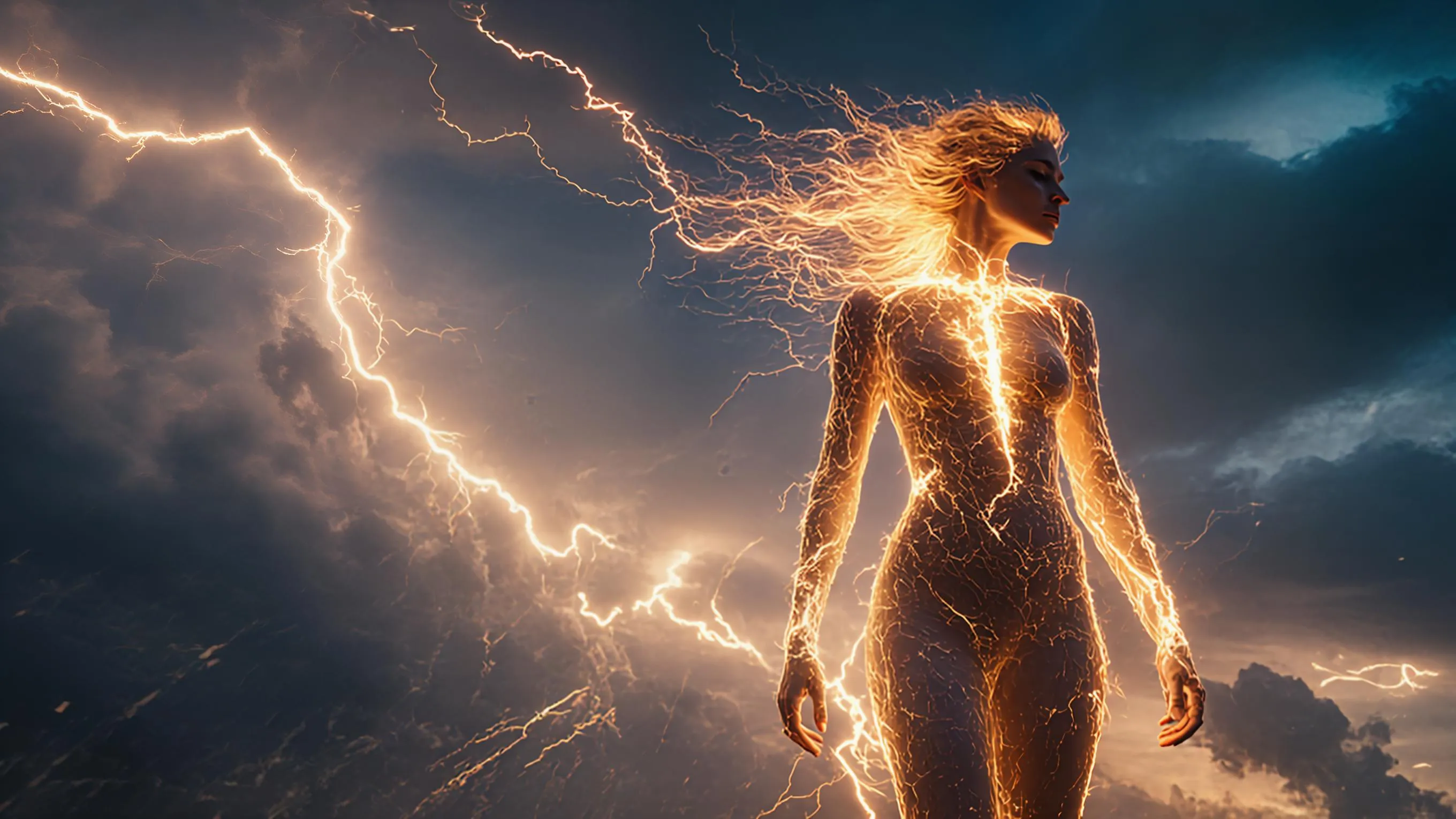 A woman with a radiant, electrifying presence, her form composed of crackling lightning, stands amidst a stormy sky. Her flowing hair and garments shimmer with electric charges, casting dynamic shadows. The tempestuous scene around her features dark clouds and flashes of thunder, illuminated by the vibrant glow of her powerful, animated body. The lighting is dramatic, with intense streaks of light contrasting against the deep, moody tones of the environment. The overall style is a blend of realism and surrealism, emphasizing the awe-inspiring and otherworldly nature of her existence.