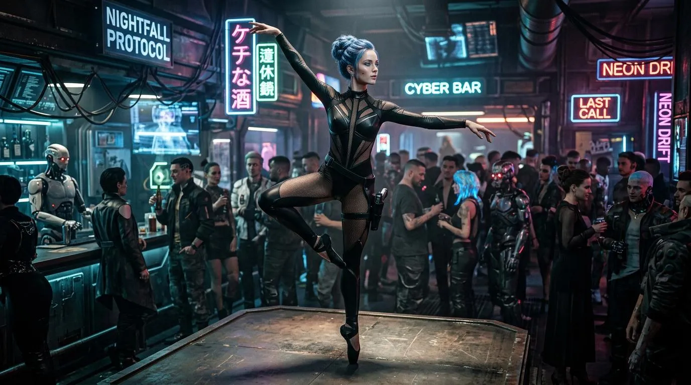 A hyper-realistic, high-resolution full-body fashion photograph set inside a futuristic cyberpunk bar at night. The bar is stylish but slightly worn, with a lived-in atmosphere that suggests better days in the past, now rediscovered by the party scene. Diverse patrons fill the space: people from all social classes, cyborgs, clones, and other futuristic characters, all dressed in subtly futuristic and elegant clothing that feels refined but not exaggerated. The crowd looks fashionable, with sleek materials, modern silhouettes, and restrained cyberpunk details, while still remaining believable and grounded. The scene feels gritty but not dirty, atmospheric but still elegant, with neon reflections, metallic surfaces, moody shadows, and subtle signs of age and use. On a raised stage stands a stunning Caucasian ballerina in a classic ballet pose. She is the clear focal point and is never blocked by the crowd. She wears a skin-tight couture outfit that could have been designed by Karl Lagerfeld, with elegant cutouts that emphasize the female form without being explicit. No tutu. Her outfit contrasts clearly with the surrounding environment. She also wears a futuristic pistol holster with a sleek sci-fi handgun. She has bright blue eyes, subtle futuristic makeup, and futuristic blue hair. The ballerina is slightly brighter illuminated than the surrounding bar, with soft indirect light highlighting her figure. The camera captures her in a full-body shot while also showing the lively bar atmosphere behind her. Realistic photography, authentic people, cinematic lighting, sharp focus on the ballerina, natural depth, ultra-detailed, not animated, not cartoon, not comic, not illustration.