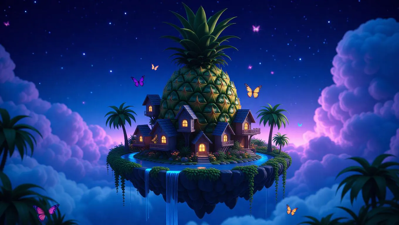 A whimsical floating forest shaped like a giant pineapple, adorned with tiny butterfly-shaped houses and rivers flowing with vibrant nectar, suspended under a starry night sky, with glowing orbs and a soft wind.