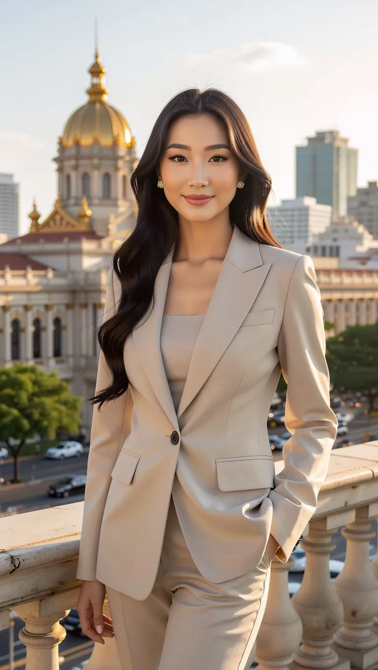 Create a confident modern Asian professional in Phnom Penh with AI-generated precision. Ultra-clear visuals highlight her tailored neutral suit, golden-hour glow, and radiant smile against Cambodia's Royal Palace backdrop. Golden Eyeballs effect enhances allure while blending colonial architecture, bustling streets, and Tonlé Sap riverside vibrancy. Perfect fusion of contemporary elegance and dynamic Southeast Asian energy for branding or editorial visuals.