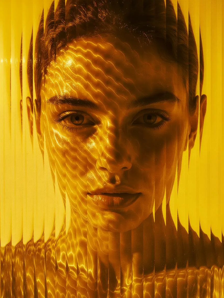 A surreal portrait of a person behind a textured, vertical ribbed glass panel, their face partially visible and heavily distorted, creating a wavy, abstract visual effect. Dramatic, cinematic lighting illuminates the subject in vivid gold, contrasting against a yellow background. High contrast and saturated colors enhance the mysterious, emotionally evocative mood, emphasizing artistic lighting and abstract composition.