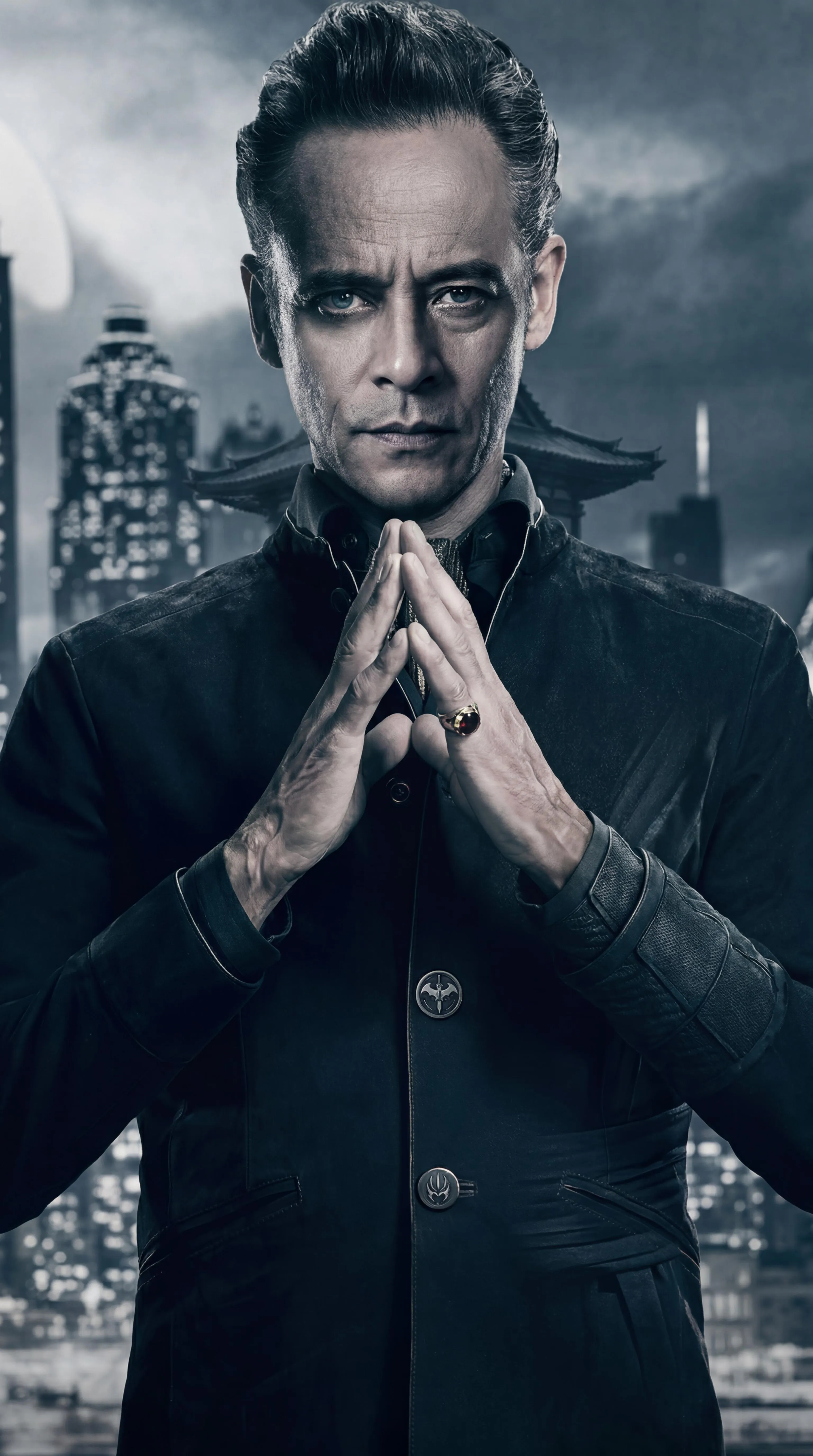 Kagenobu "Nobu" Yoshioka (portrayed by Peter Shinkoda) from the Marvel Cinematic Universe and Ra's al Ghul (portrayed by Liam Neeson) from the T.V. series Gotham interchangeably combine together into each other as one, facial and physical features and outfits alike. No sensitive information or guidelines violating content seen or involved.