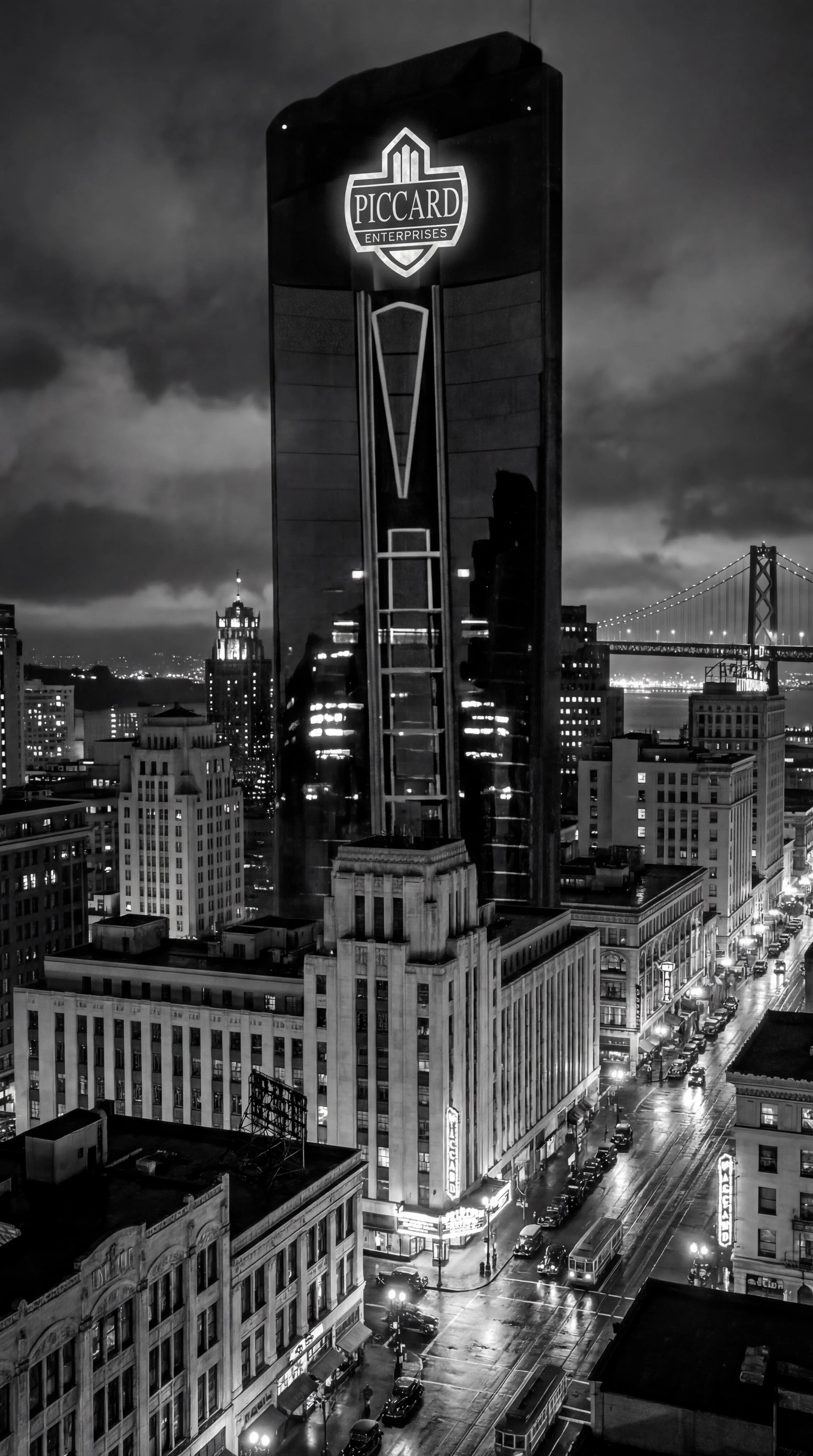 Explore Arrowverse's Wayne Tower featuring the Piccard Enterprises logo in Oakland, California (1935-1944). AI transforms this unique DC universe landmark alteration into stunning visuals. Generate iconic building images with custom logos using AI effects.
