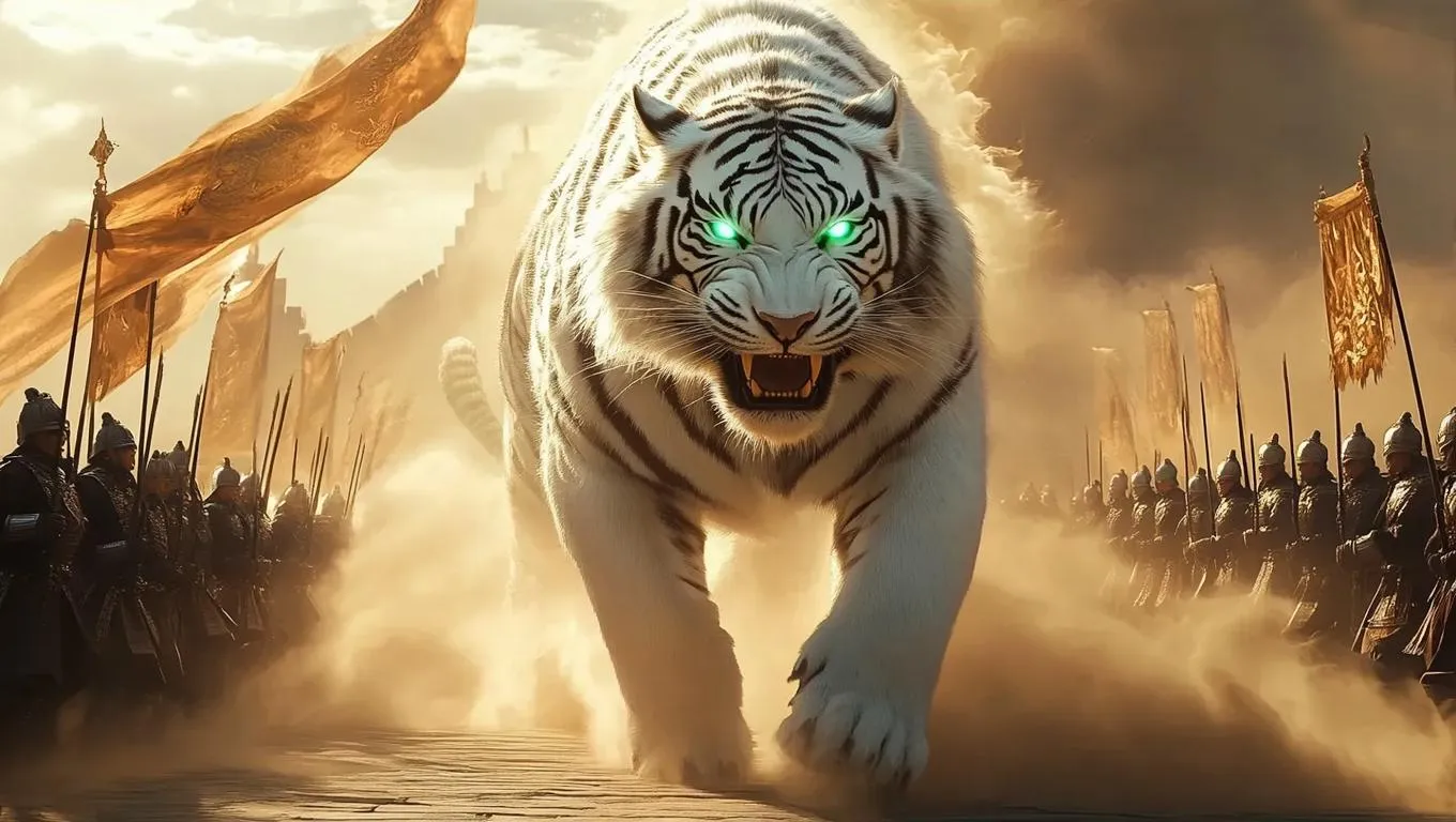 Create AI-generated Chinese-style art of a majestic silver-armored white tiger emerging from a sandstorm near a Great Wall fortress. Dynamic scene features glowing eyes, energy pulses, swirling war banners, soldiers, and golden sunlight. Use VivaGo.ai's AI tools for professional-grade mythical warrior imagery with vivid details.