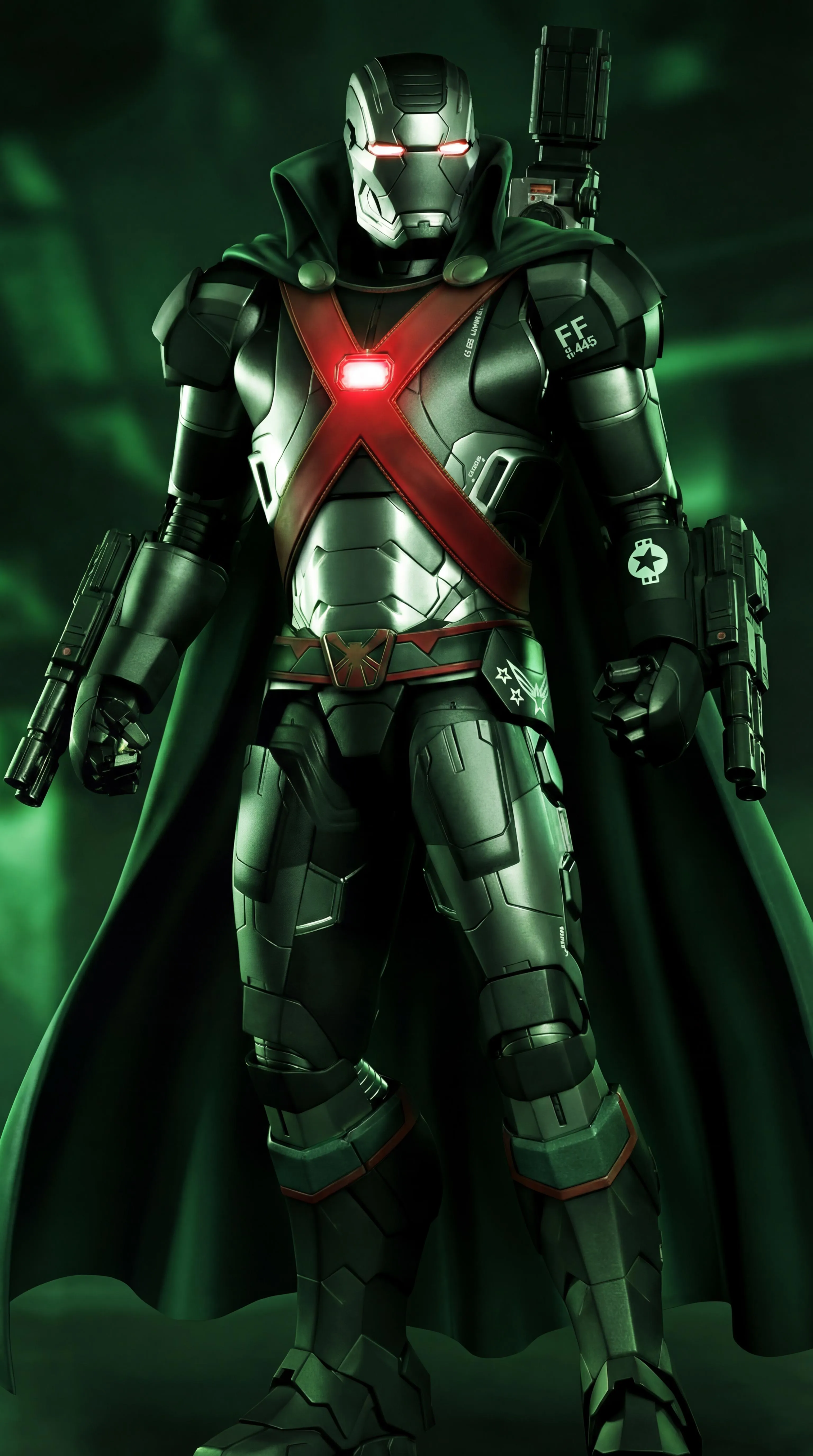 Generate the War Manhunter fusion: AI combines Martian Manhunter and War Machine into one powerful character. Features integrated armor with the iconic red X over the Arc Reactor, combined boots/belt, helmeted face, War Machine's weapons, and Martian Manhunter's cape. Create this unique superhero mashup with AI.