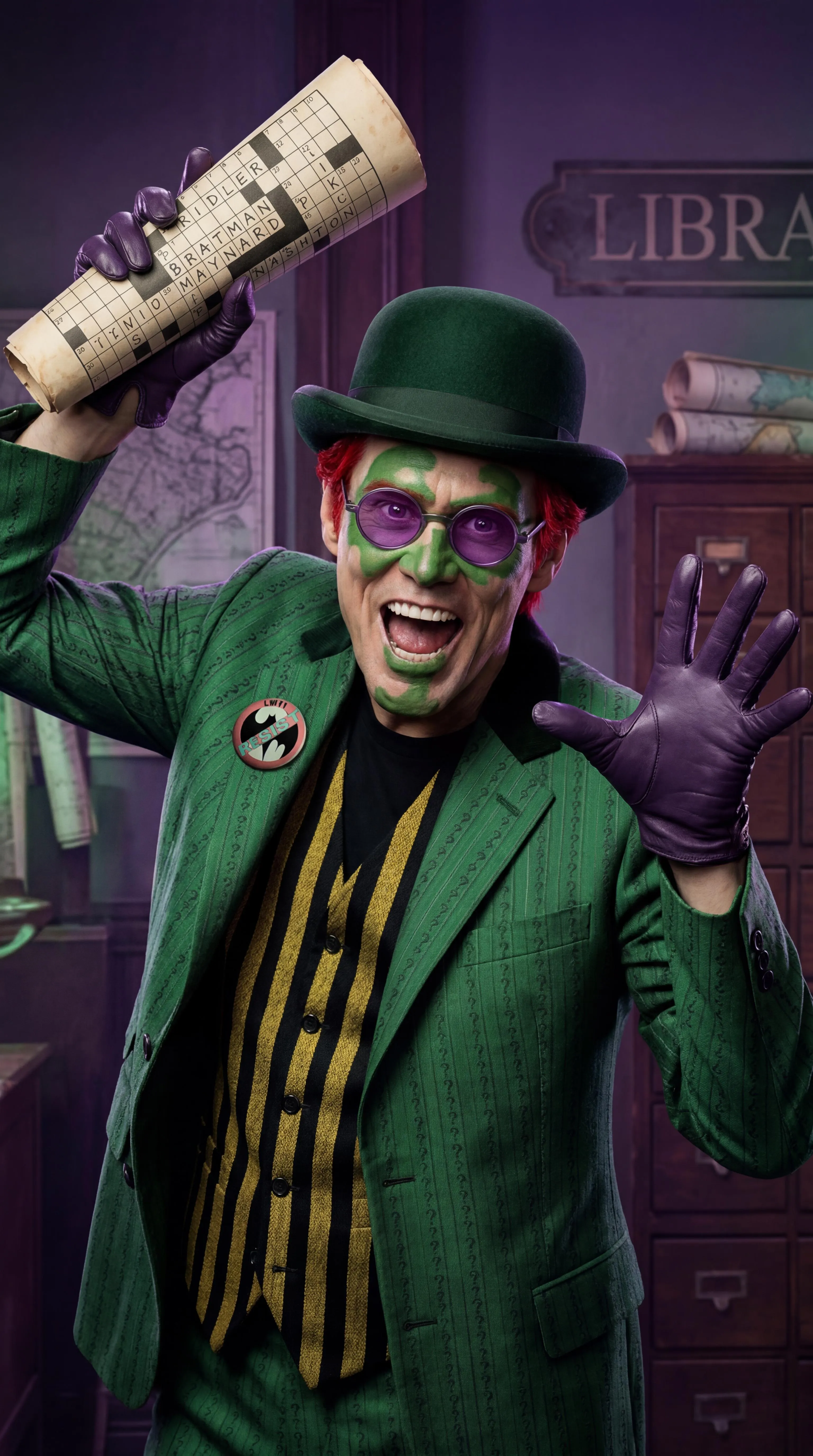 Norman Pinkus a.k.a. the Riddler (from Batman: Revolution) and Edward Nigel Maynard a.k.a. the Riddler (from Batman '89: Echoes) interchangeably combine together into each other as one with Edward Nashton a.k.a. the Riddler (portrayed by Jim Carrey in Batman Forever), facial and physical features and outfits alike, visually translating the art styles of Norman Pinkus and Edward Nigel Maynard into the realistic aesthetic of Carrey's Riddler, giving the Riddler a live-action feel. No sensitive information or guidelines violating content seen or involved.