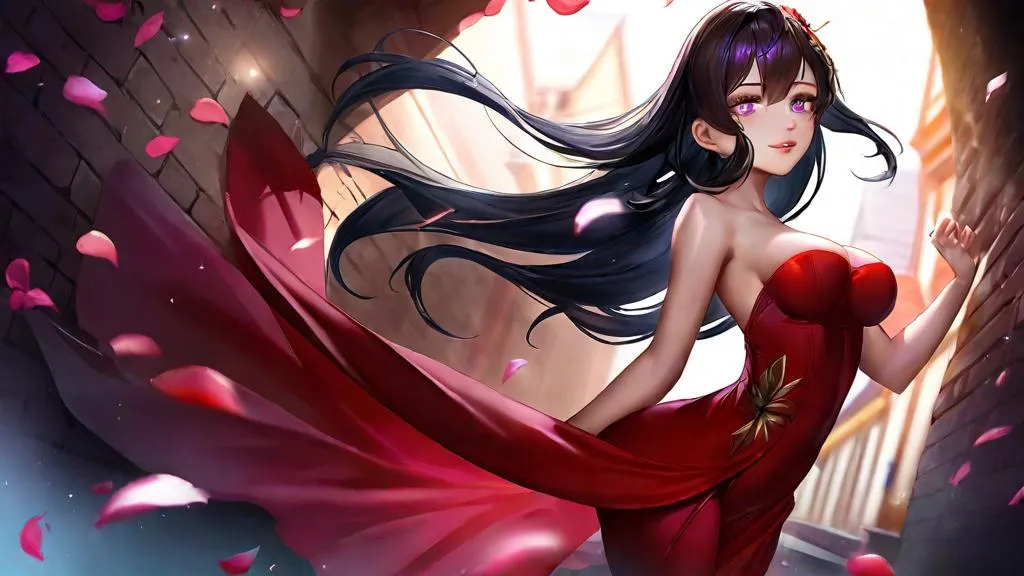 Create a mesmerizing AI-generated anime mural blending urban fantasy and graffiti art. Featuring a sensual, luminous figure with flowing hair amidst vibrant crimson/violet hues, mystical roses, and moons. Perfect fusion of ethereal beauty and urban decay for captivating 16:9 visuals. Ideal for vibrant, seductive anime-style artwork with a touch of mystical allure.