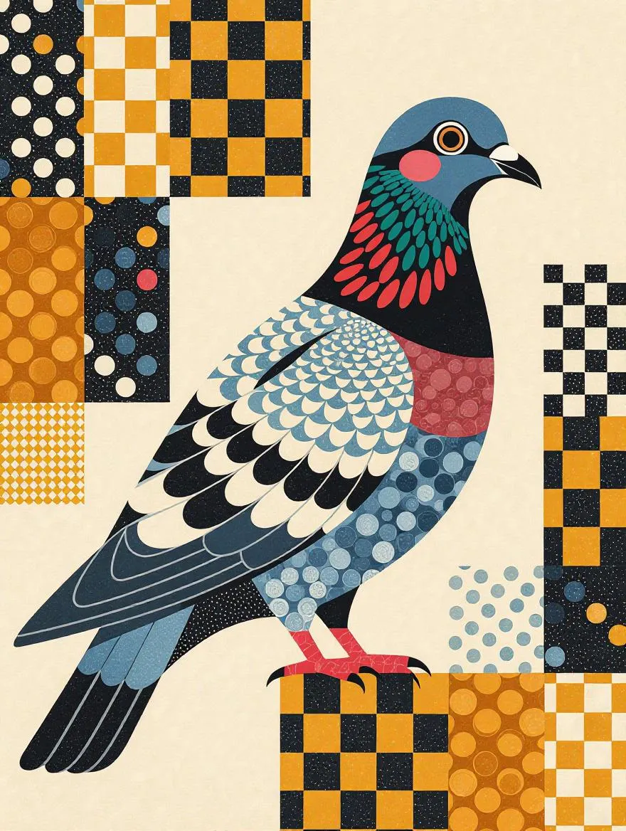 AI-generated geometric pigeon art with ink textures and mixed media patterns. Symmetrical bird illustration blending organic brush-strokes, splashes & geometric shapes. Modern abstract animal design featuring balanced patchwork composition and harmonious aesthetic. Create this unique AI art effect at vivago.ai.