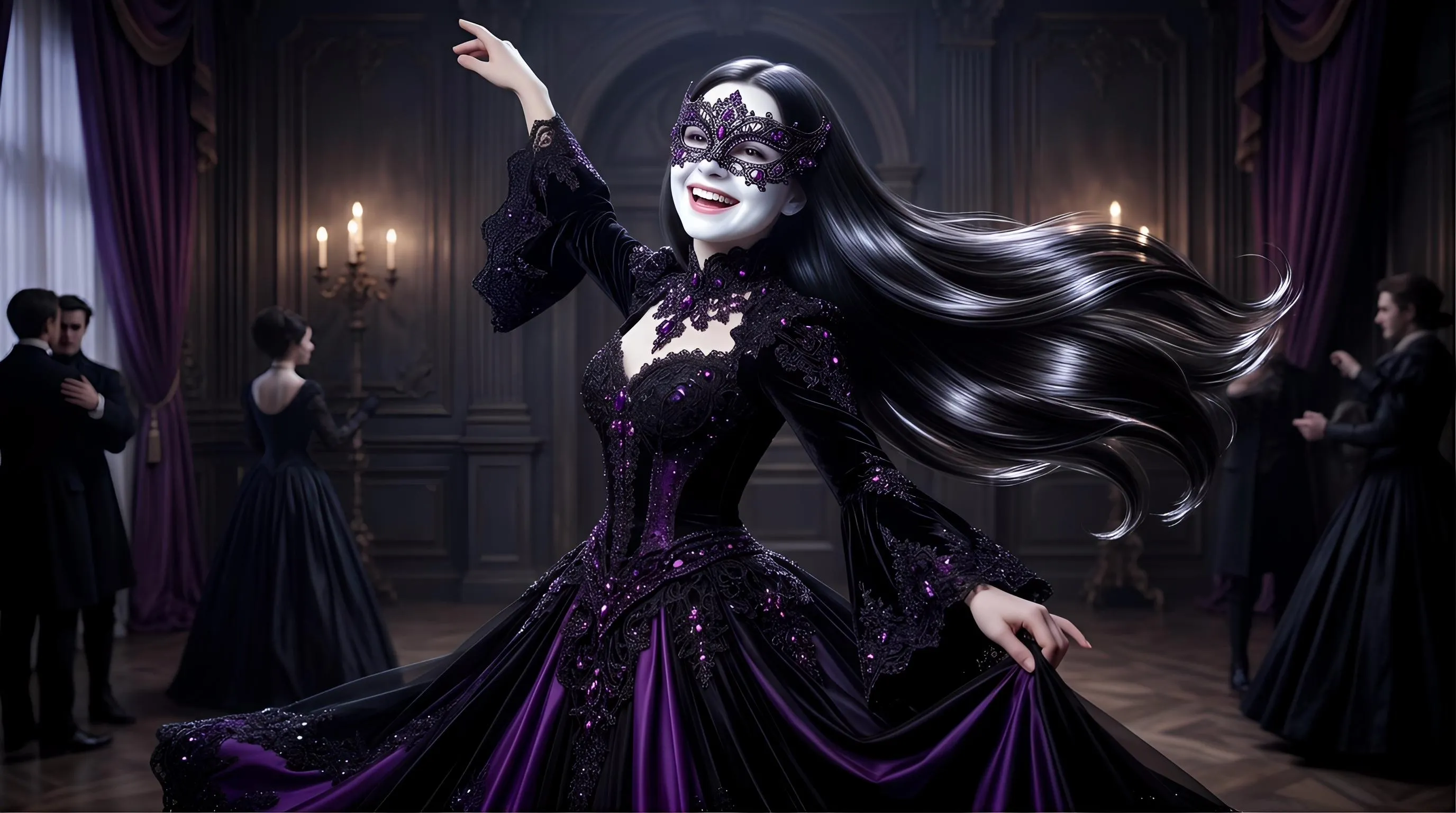 Put to the girl this dress posing and dancing.And put her a mask withsame colors like the dress.Make her hail long and shining and her face white and glowing and smiling